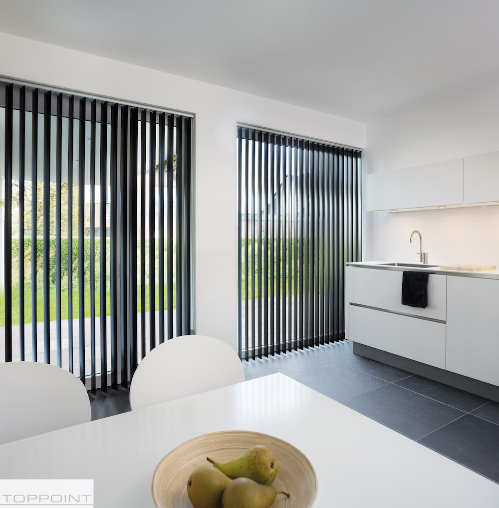 Dankzij maatwerk kunnen verticale lamellen ook gebruikt worden bij ramen met een schuine boven- of onderkant. Door de lamellen te kantelen of volledig open te schuiven, bepaalt u zelf de hoeveelheid lichtinval en privacy.