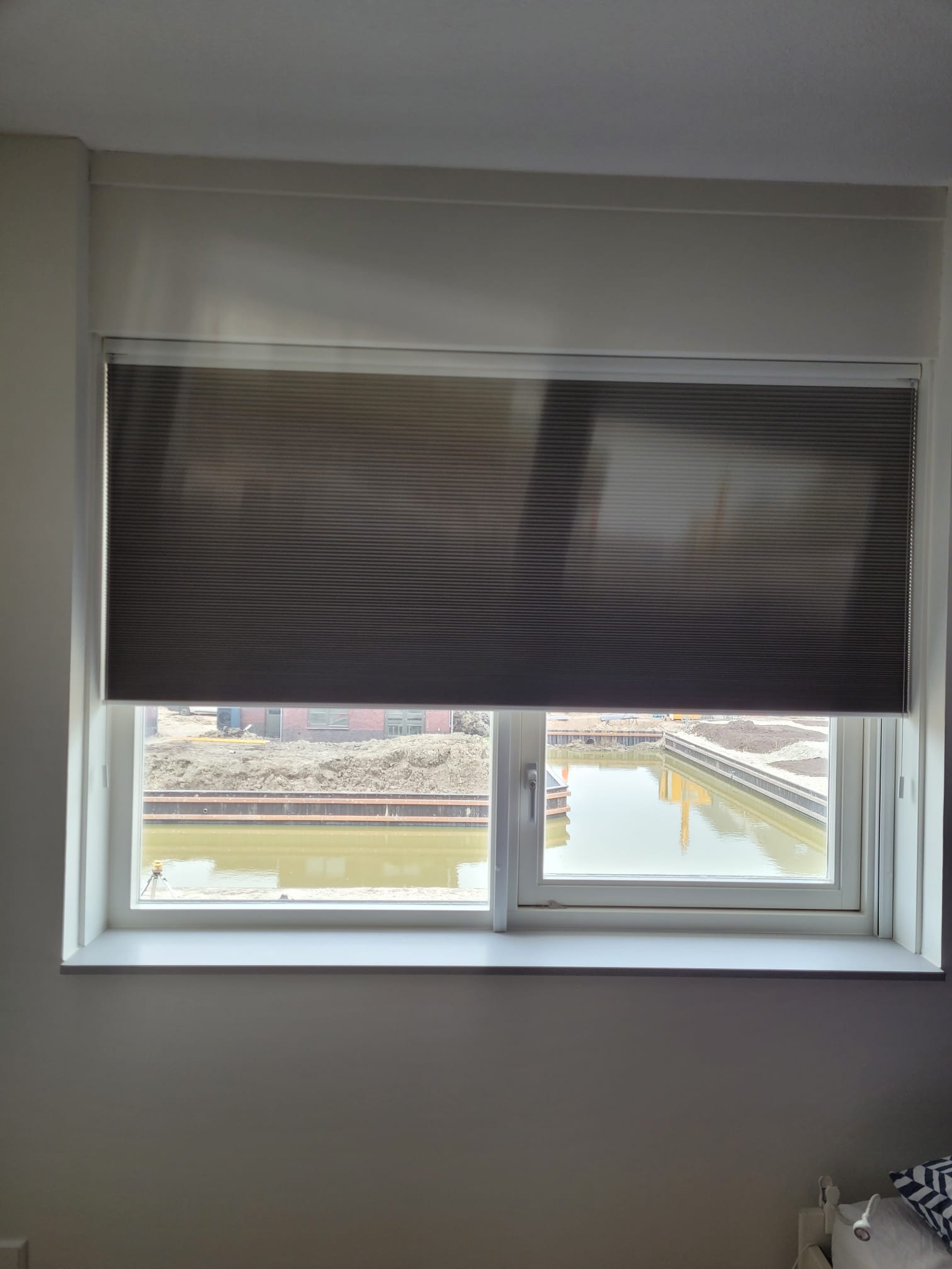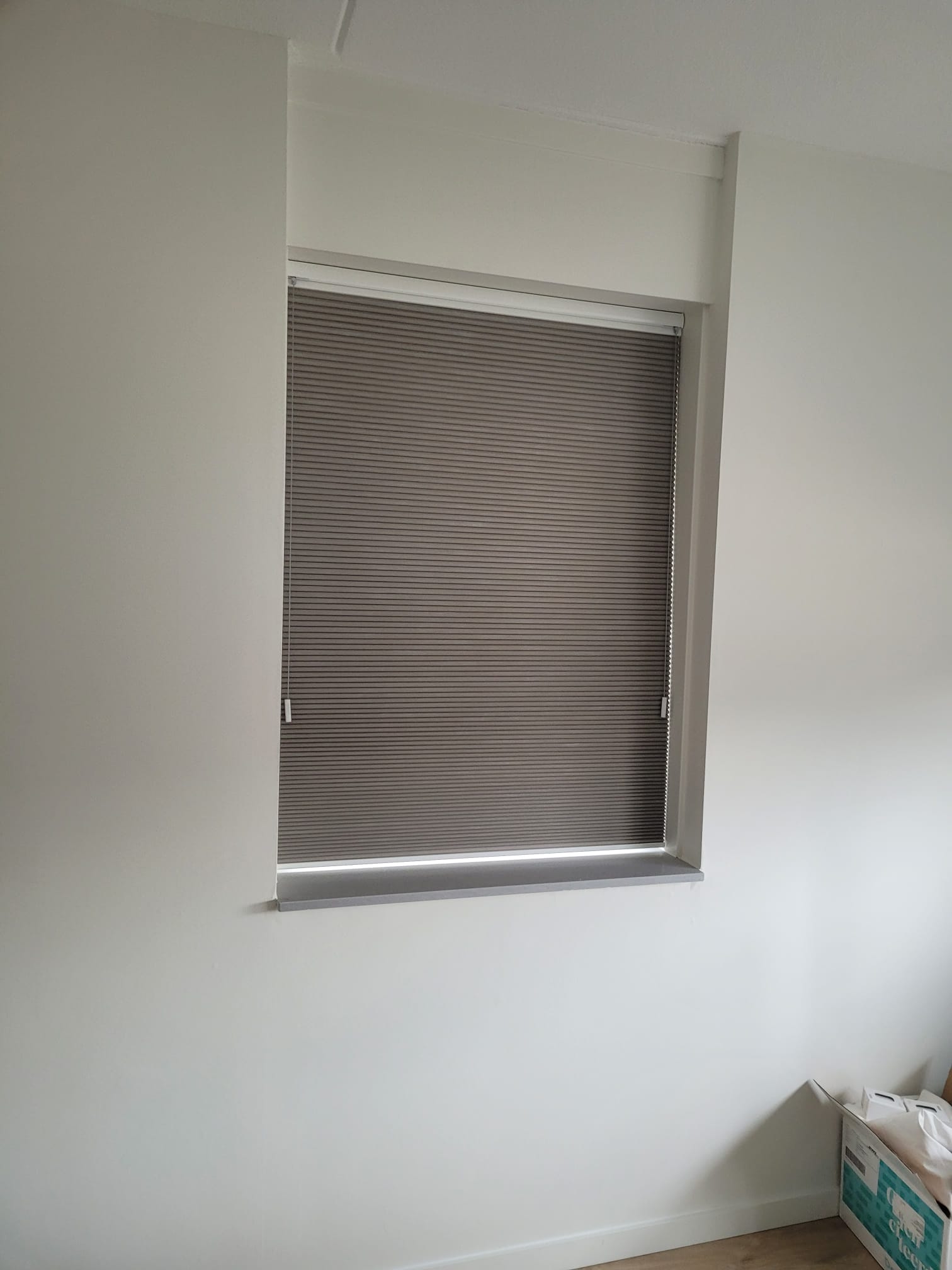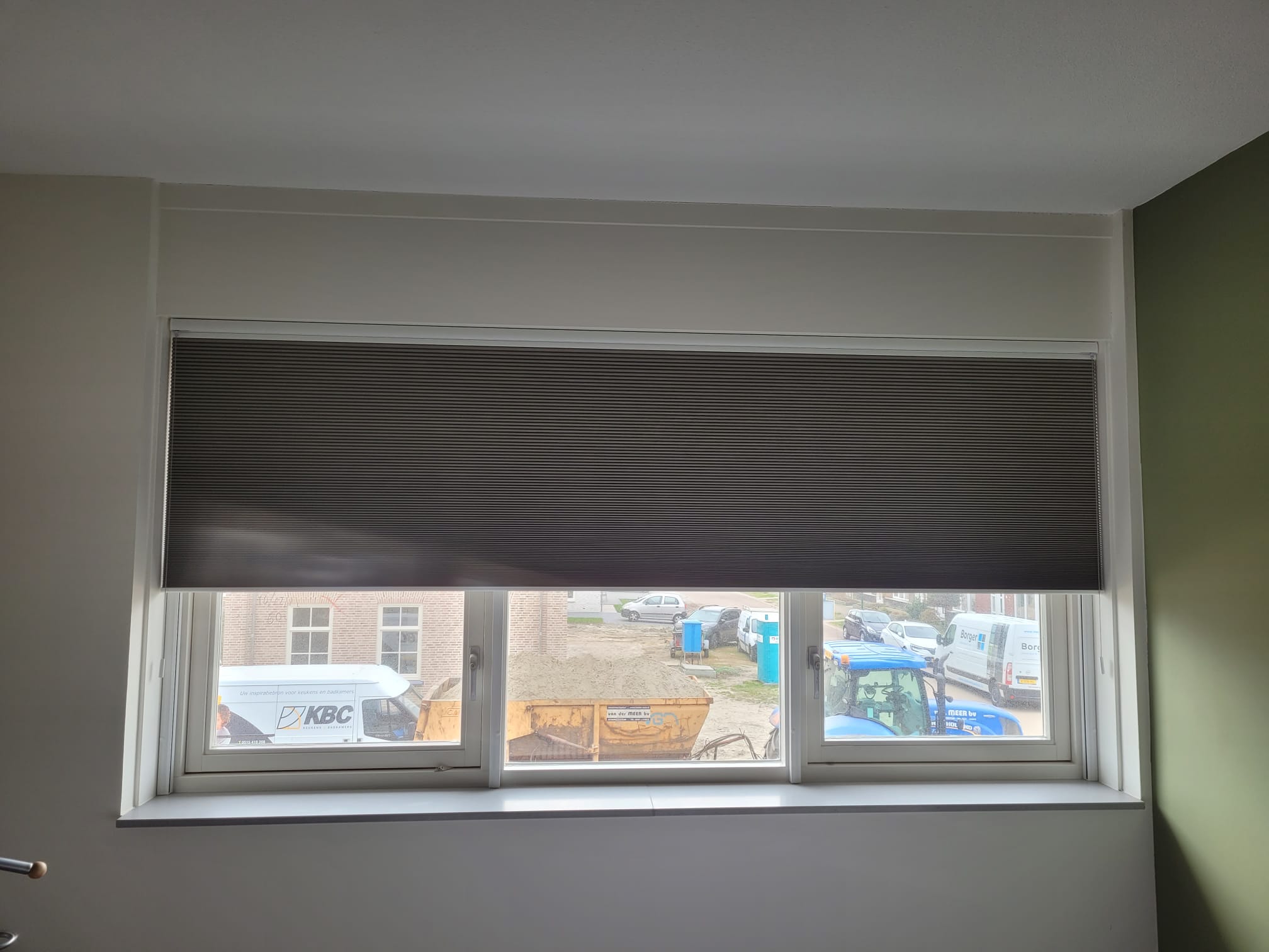 Deze nieuwbouwwoning voorzien van meerdere duettes en een plissé hordeur.