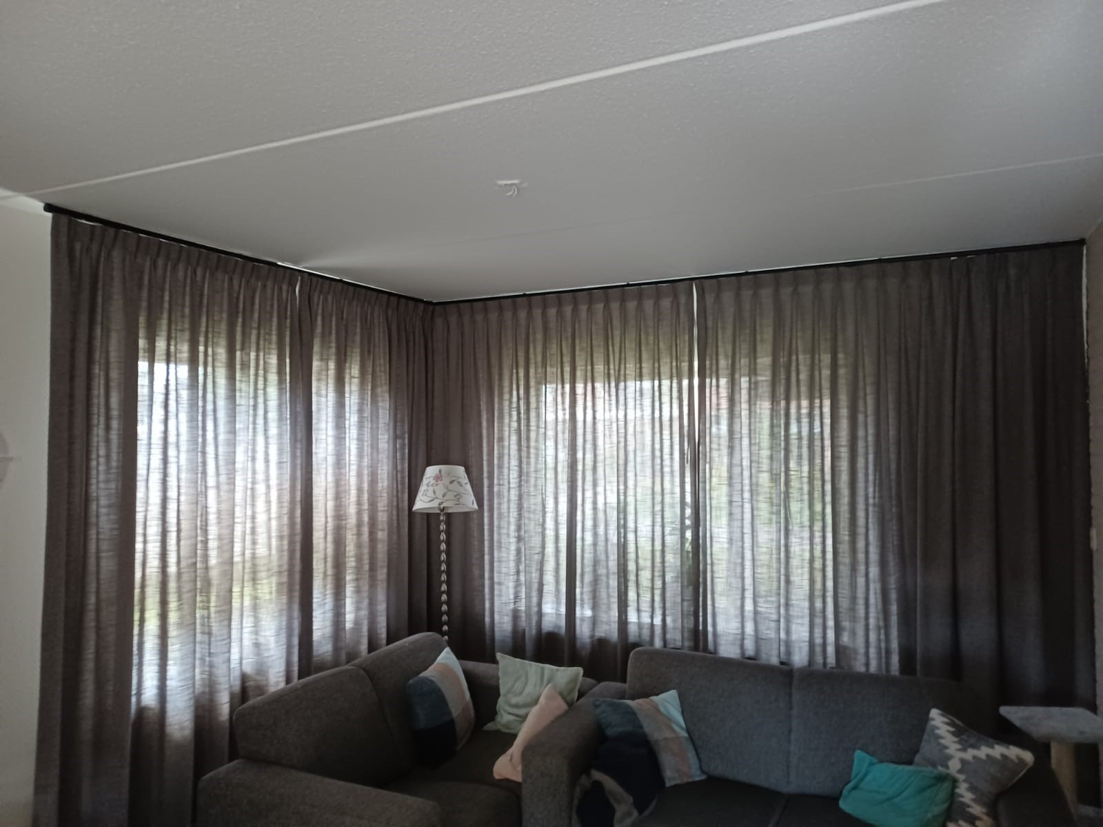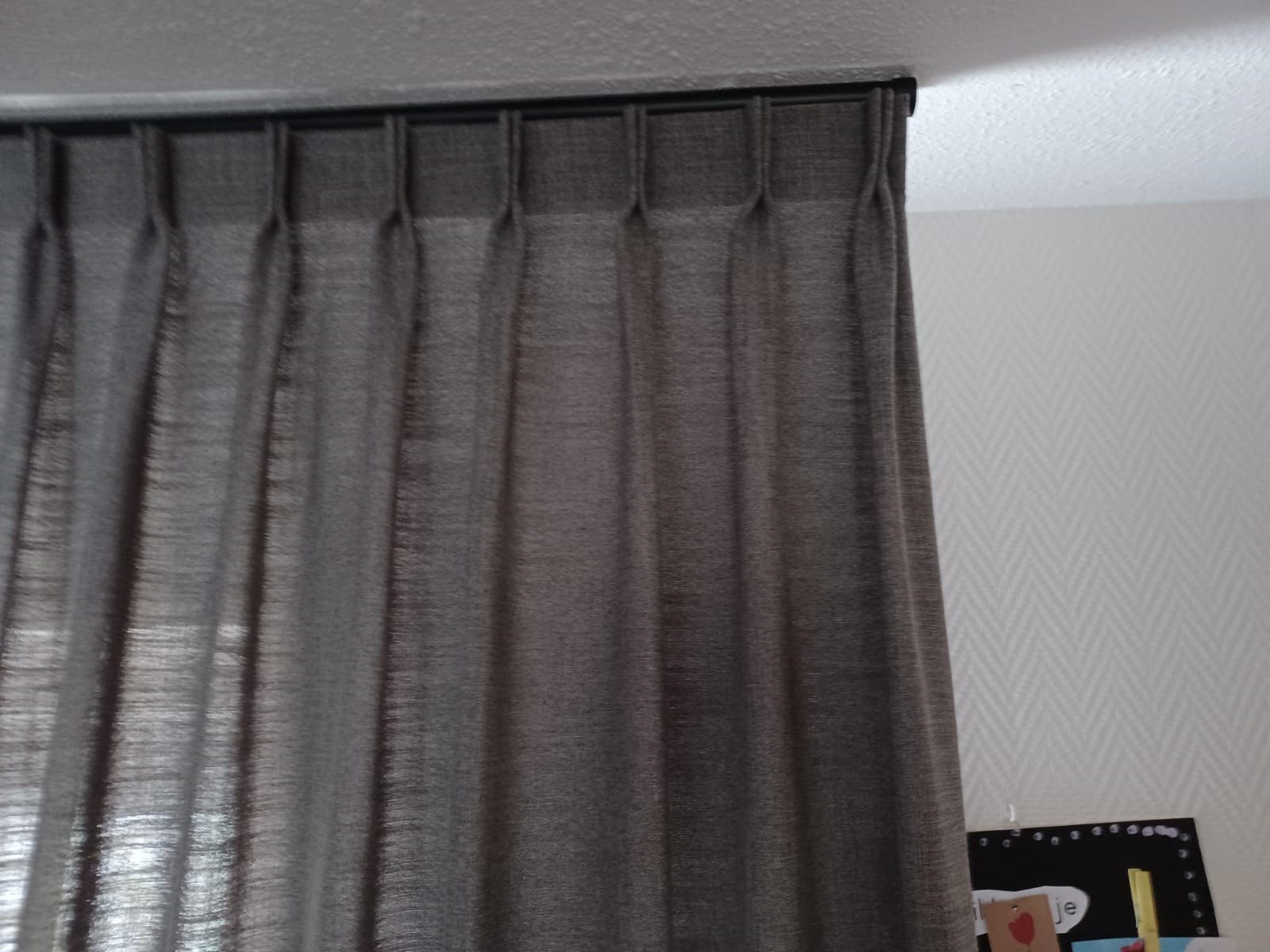Deze klant koos voor het Oslo gordijn, kleur Lei. Vlinderplooi op zwarte roede.