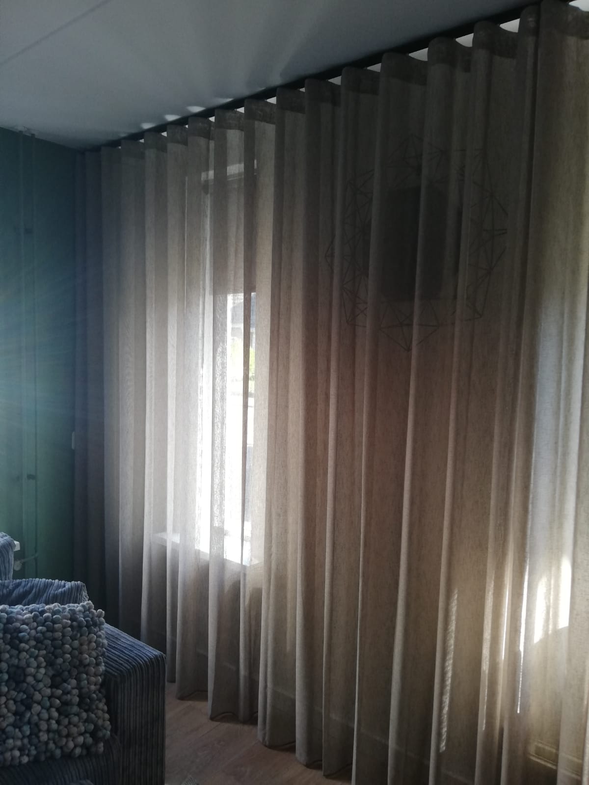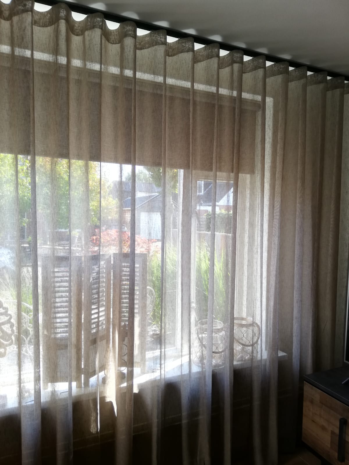In dit geval is gekozen voor een extra eyecatcher, namelijk de zwarte roede. Daarnaast hangt deze Inbetween in een zogenaamde Wave plooi. Deze plooi zorgt voor een luxere uitstraling en wanneer je het gordijn in een “pakketje” hangt, neemt het niet veel ruimte in beslag.
