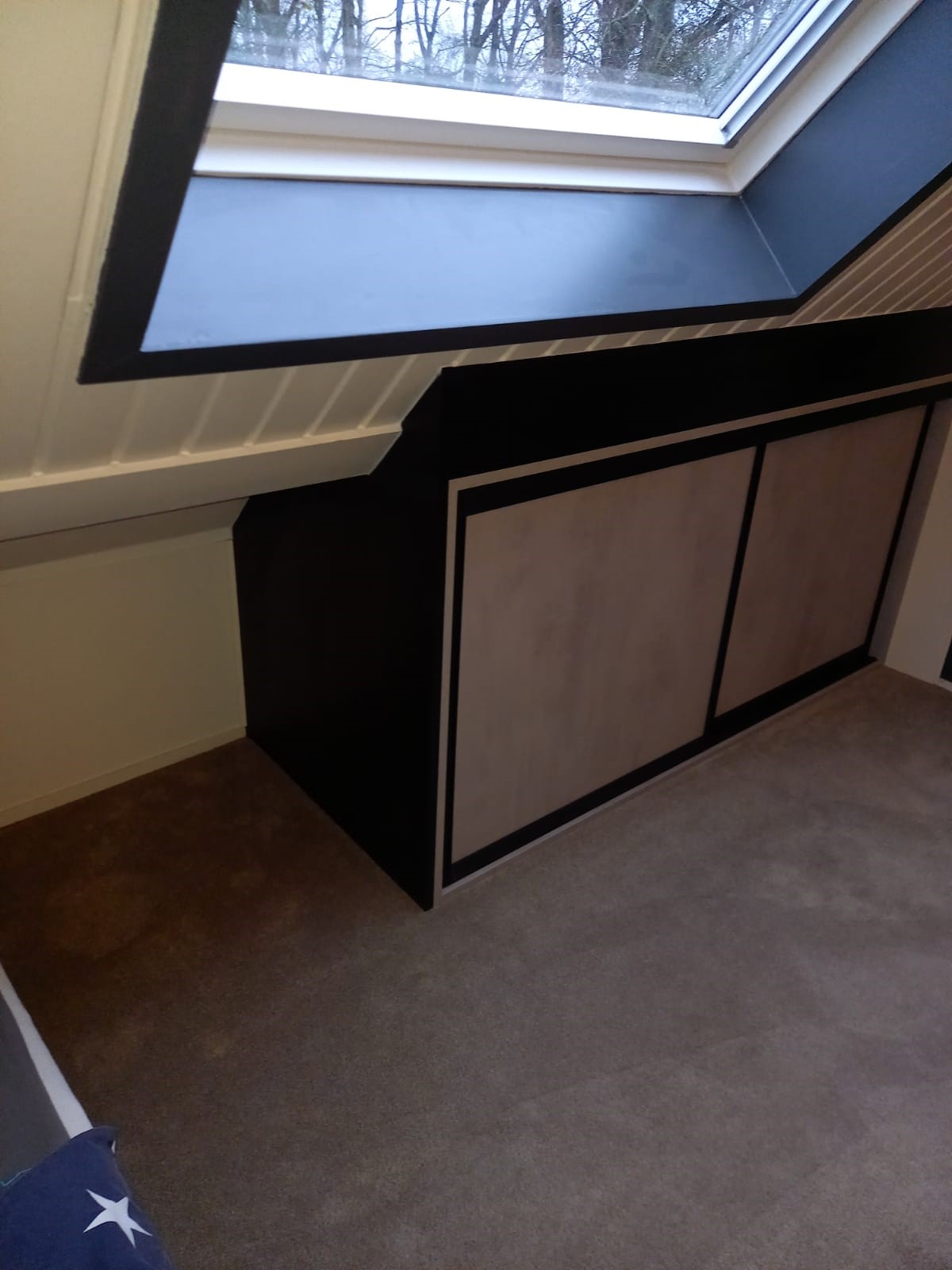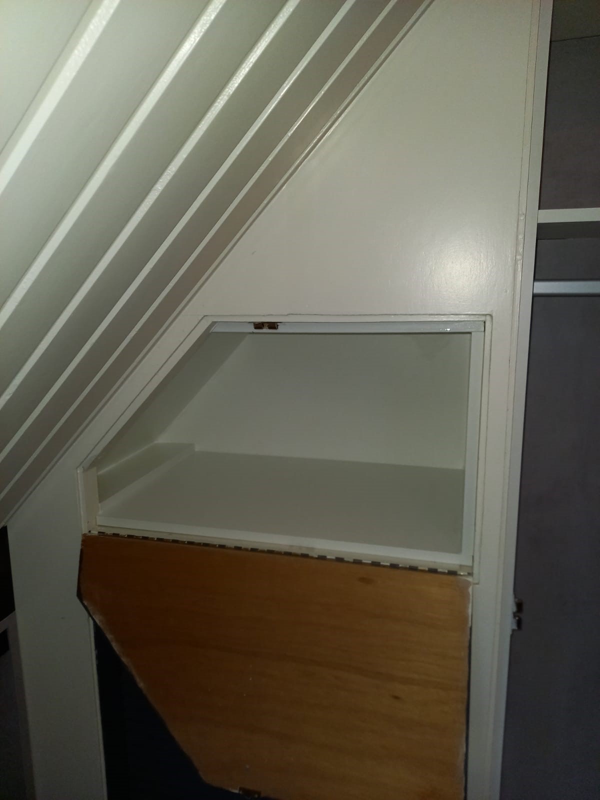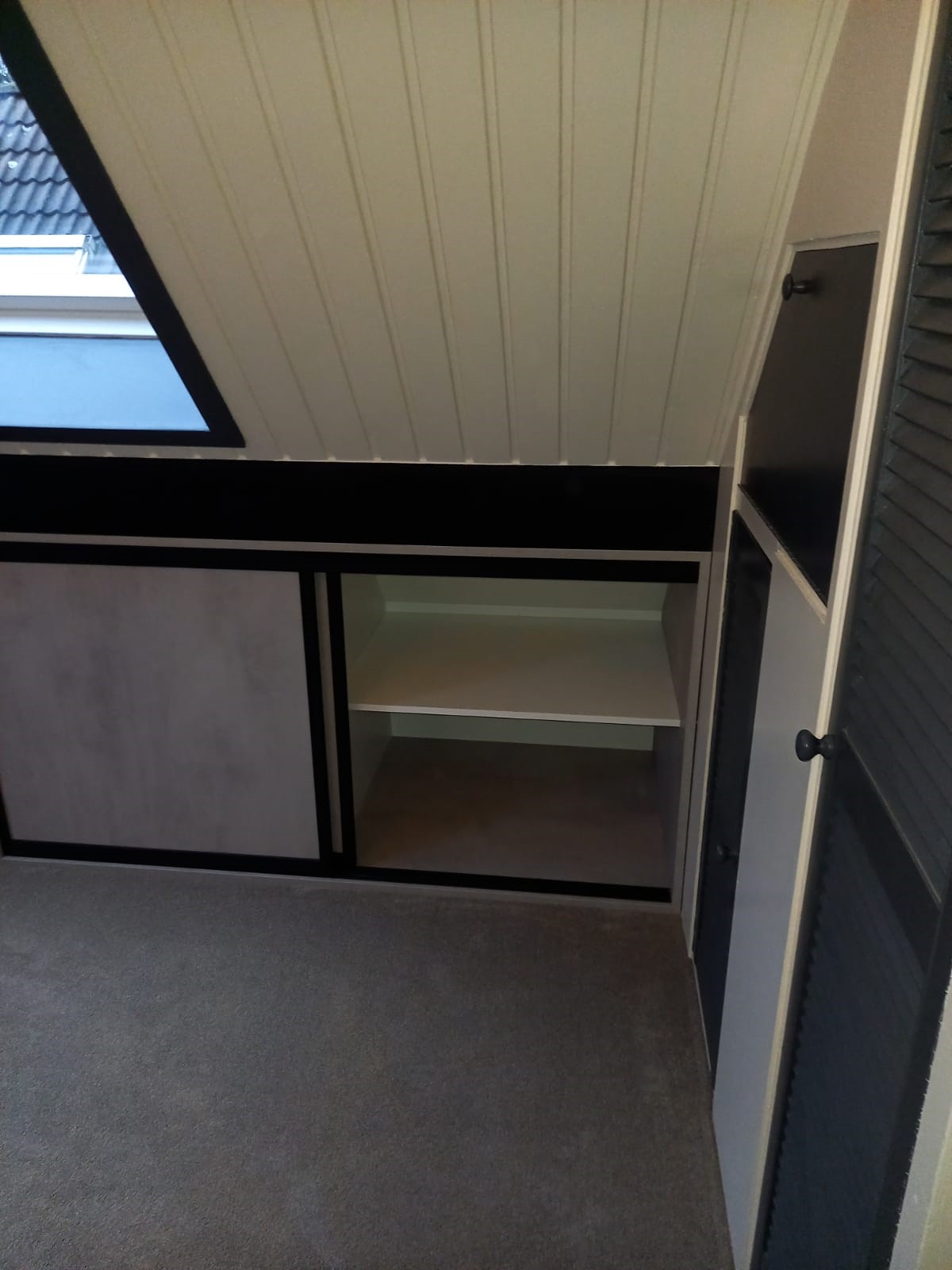 Naast de grote kast, met volop leg mogelijkheden, is er onder de scheve wand ook nog een kleine kast gemonteerd. Op deze manier benut je de ruimte optimaal.
