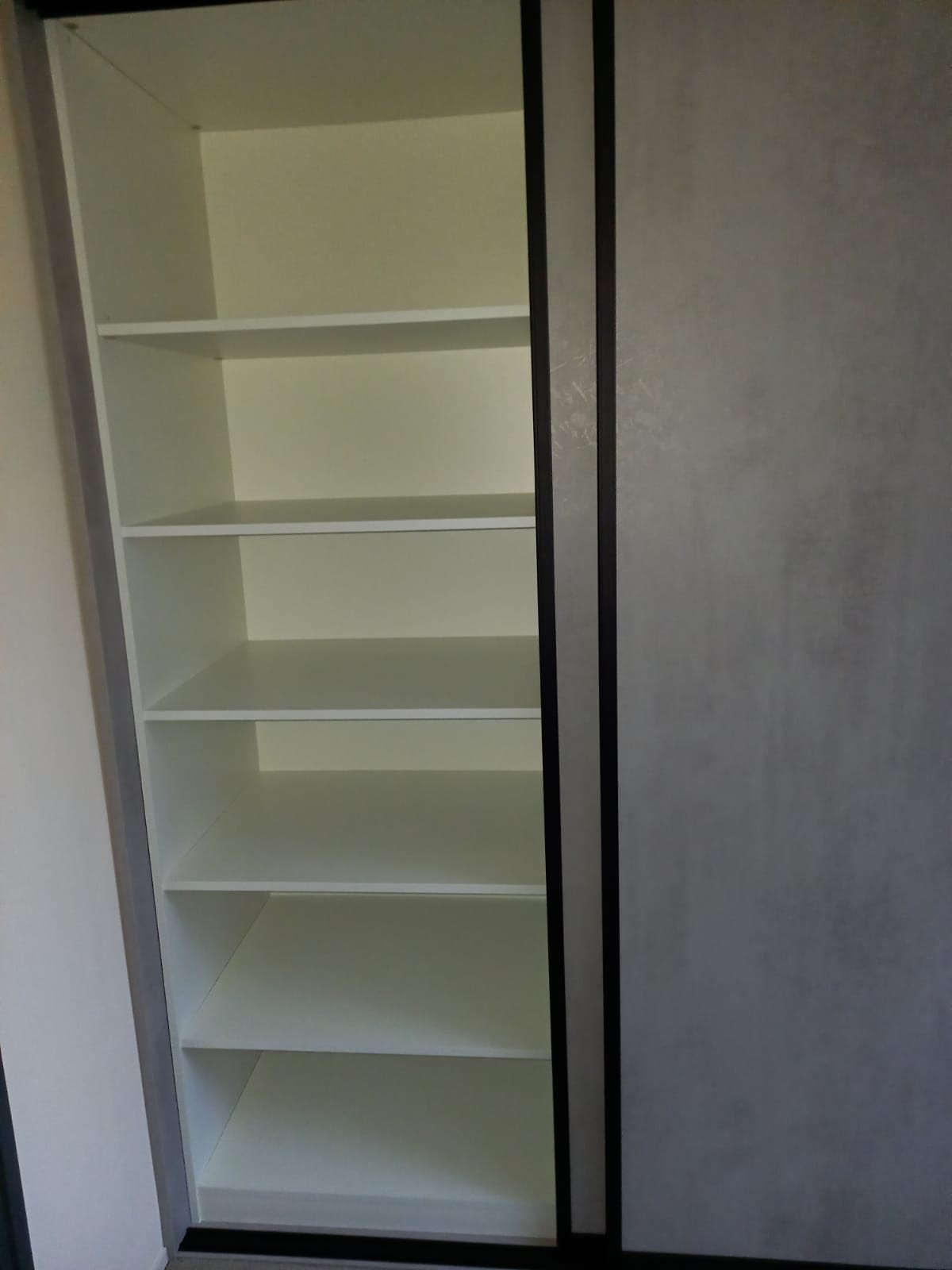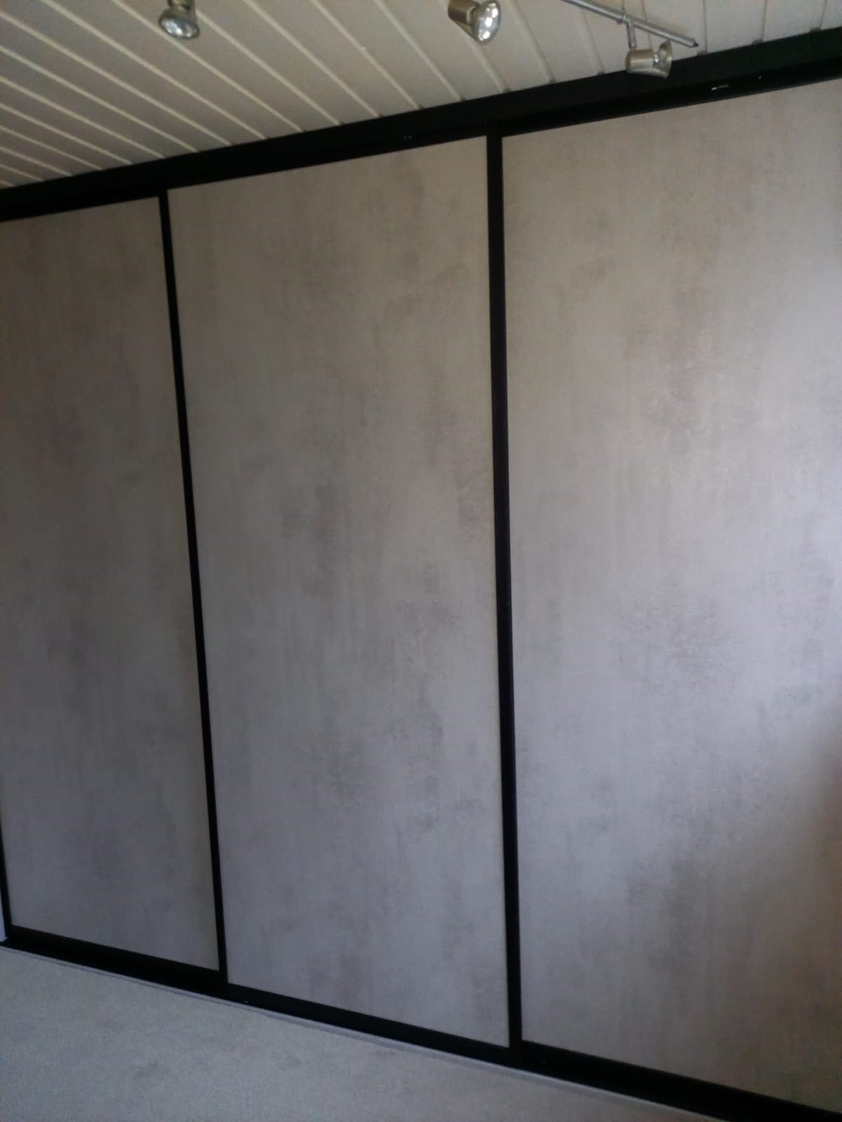 Deze kast op maat van het model Stretto, is uitgevoerd in het decor Beton structuur en heeft een mat zwarte greeplijst.