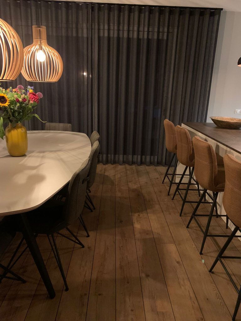 In deze woning hebben we de Mfor Mocha Authentic PVC vloer met bies gelegd in de woonkamer, de woonkeuken en de entree. Dit is PVC van hoogwaardige kwaliteit. Kan tegen een stootje en krasje ;-). Ideaal voor gezinnen met kinderen en/of huisdieren. De vloeren zijn afgewerkt met een 8 cm hoge plint.