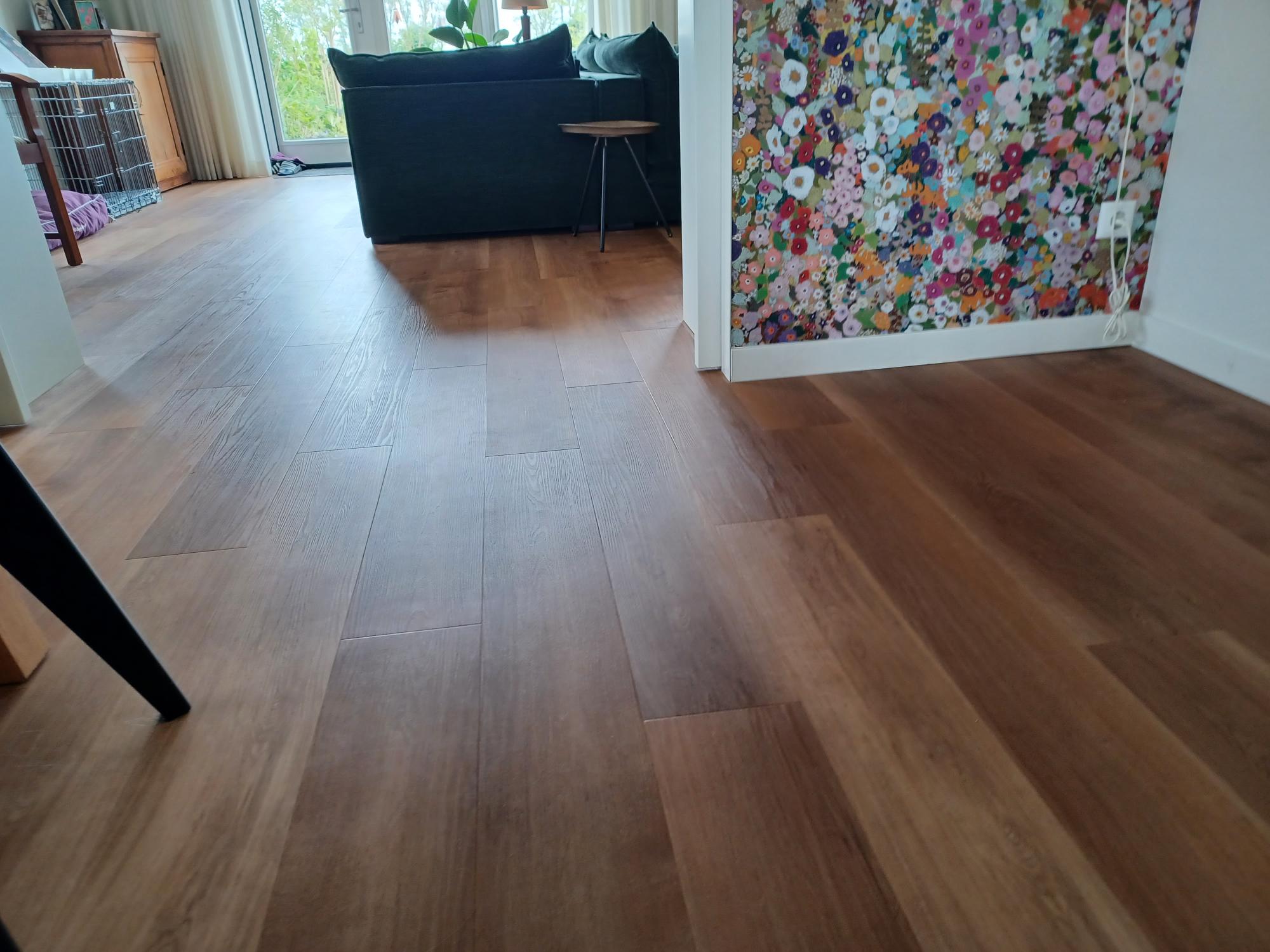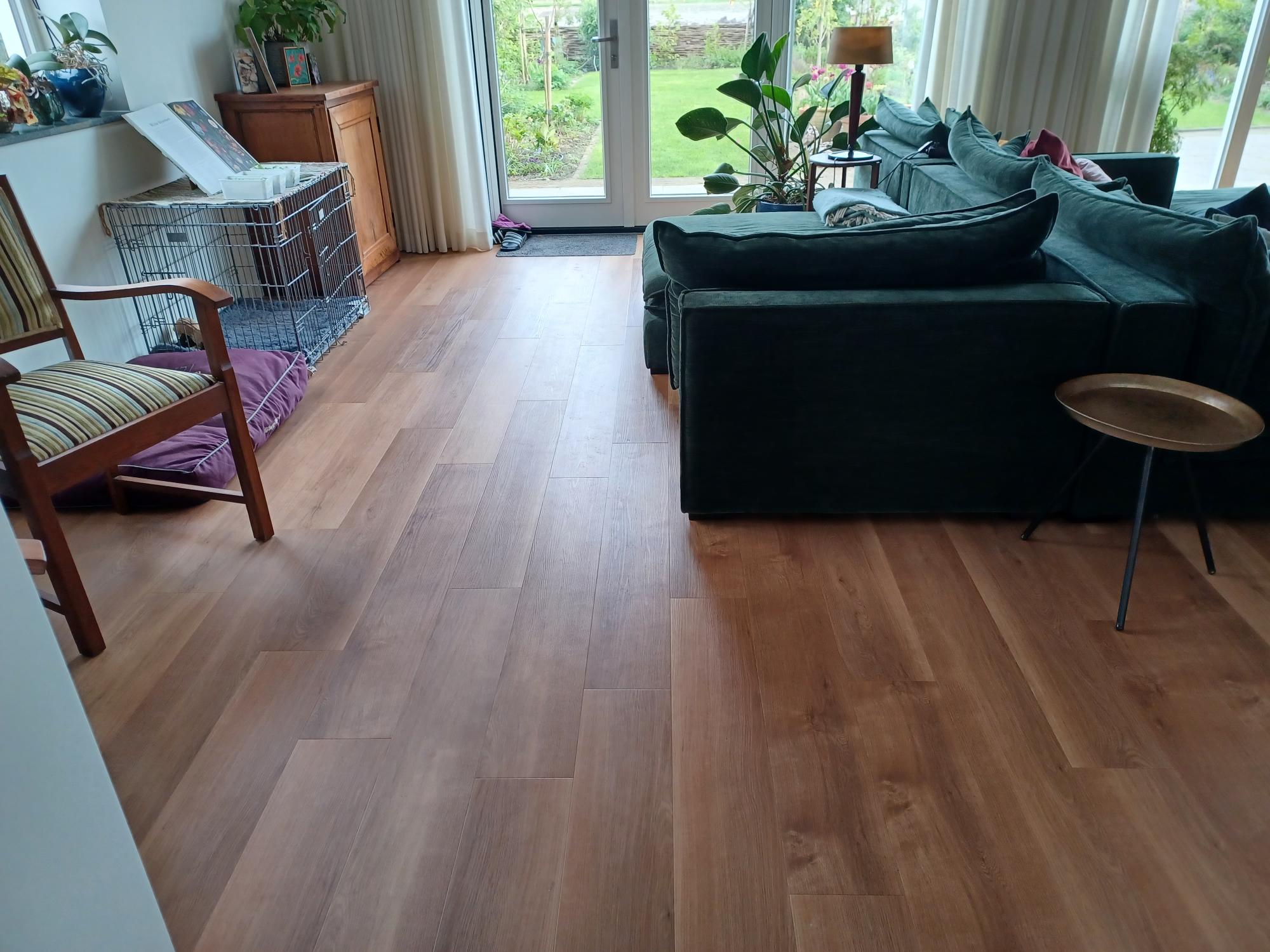 Op de foto’s zien jullie een pvc vloer van Mflor rechte plank pure Sycamaro 41822 afgewerkt met een hoge plint.  Deze vloer is gelegd op de begane grond, 1e verdieping en de 2e verdieping. Verder zien jullie vouwgordijnen gemaakt van de stof Hanne. De gordijnen met wave plooi zijn van de sof Oslo kleur ivoor en deze zijn weer op gehangen met onze mooie design rails.  Deze rail functioneert veel beter dan een standaard rail. Bij de tuindeuren hebben we een plissé hordeur geplaatst en boven hebben we diverse inzethorren geplaatst. Een leuk project om uit te voeren.