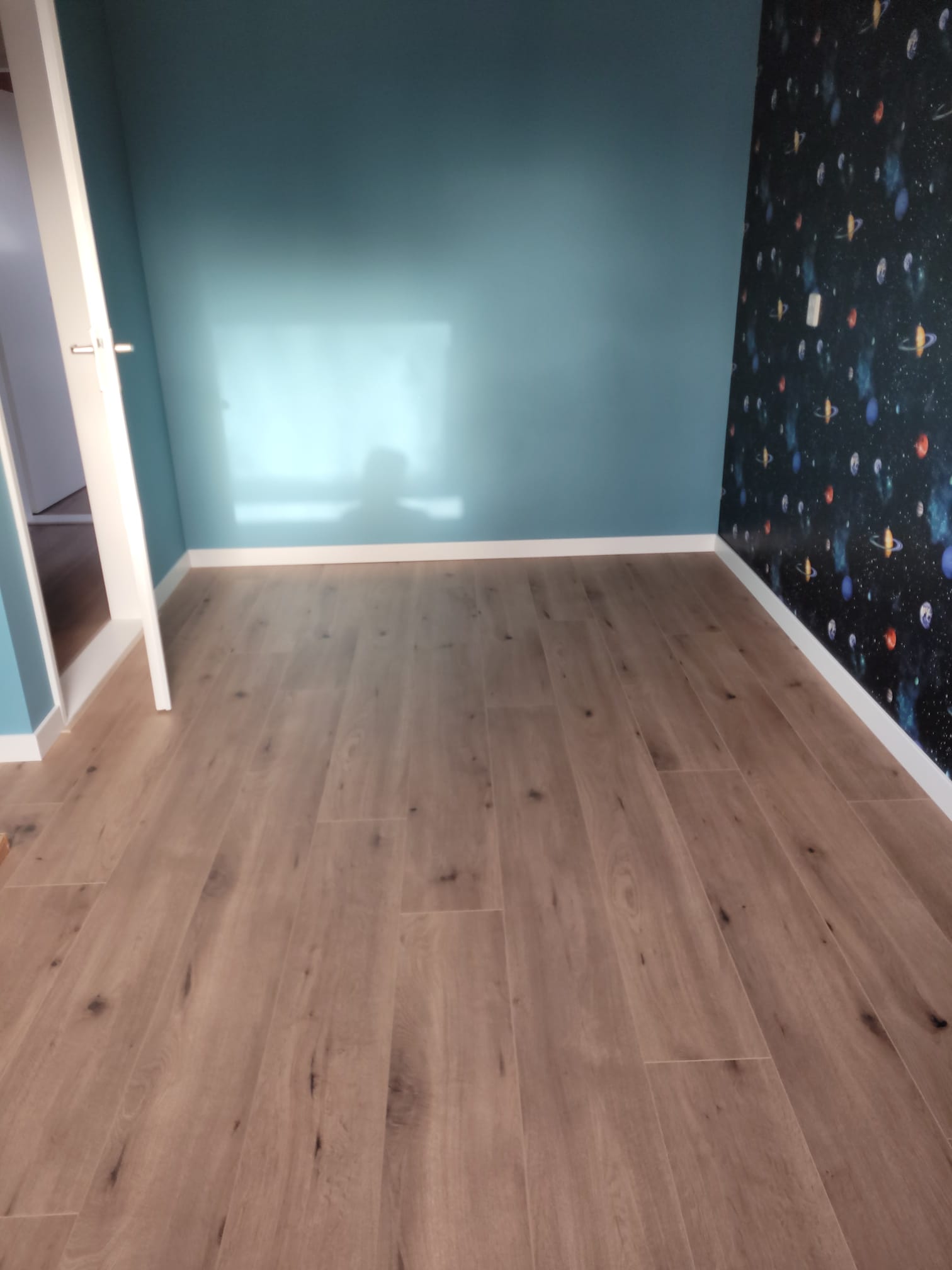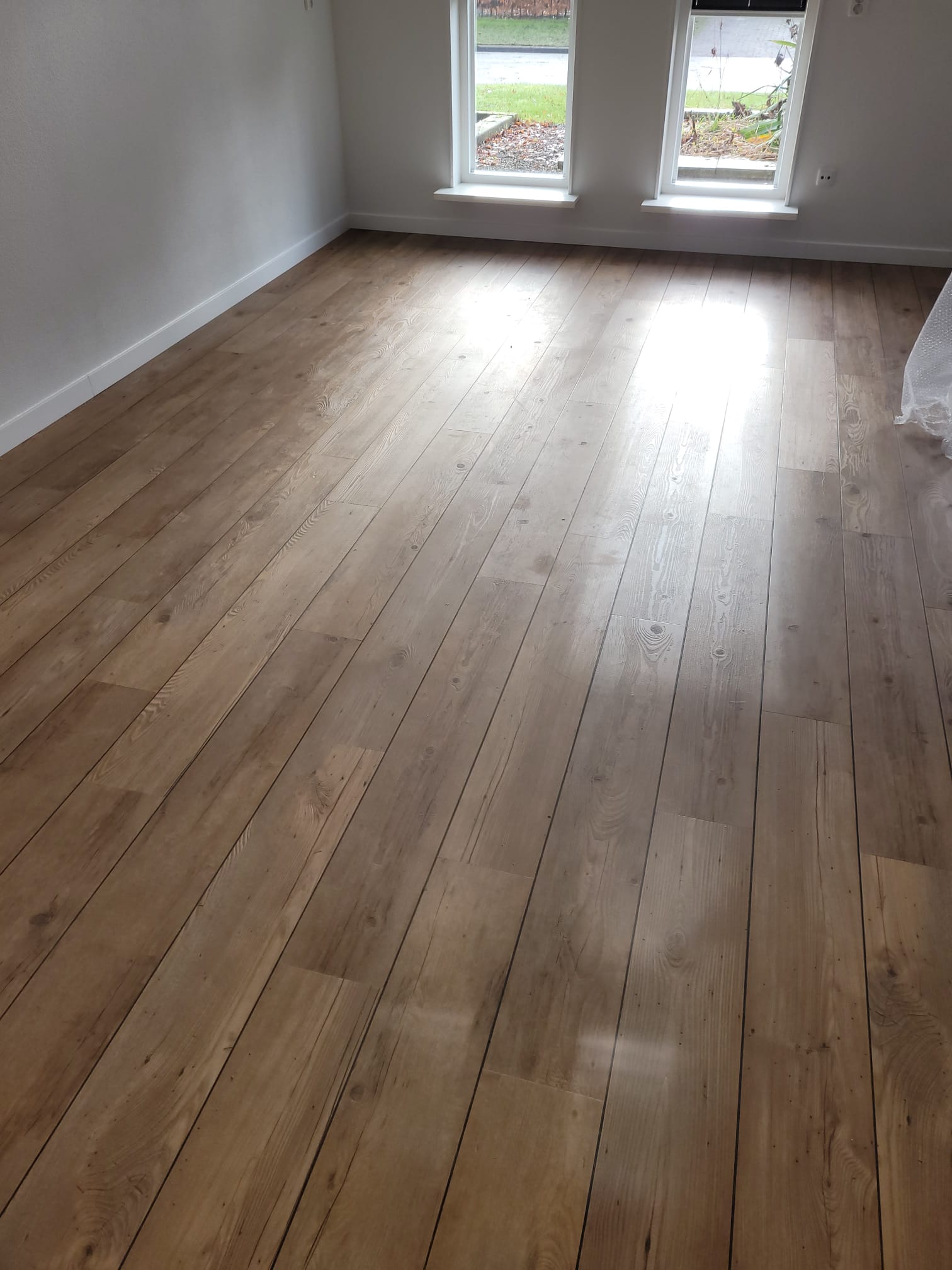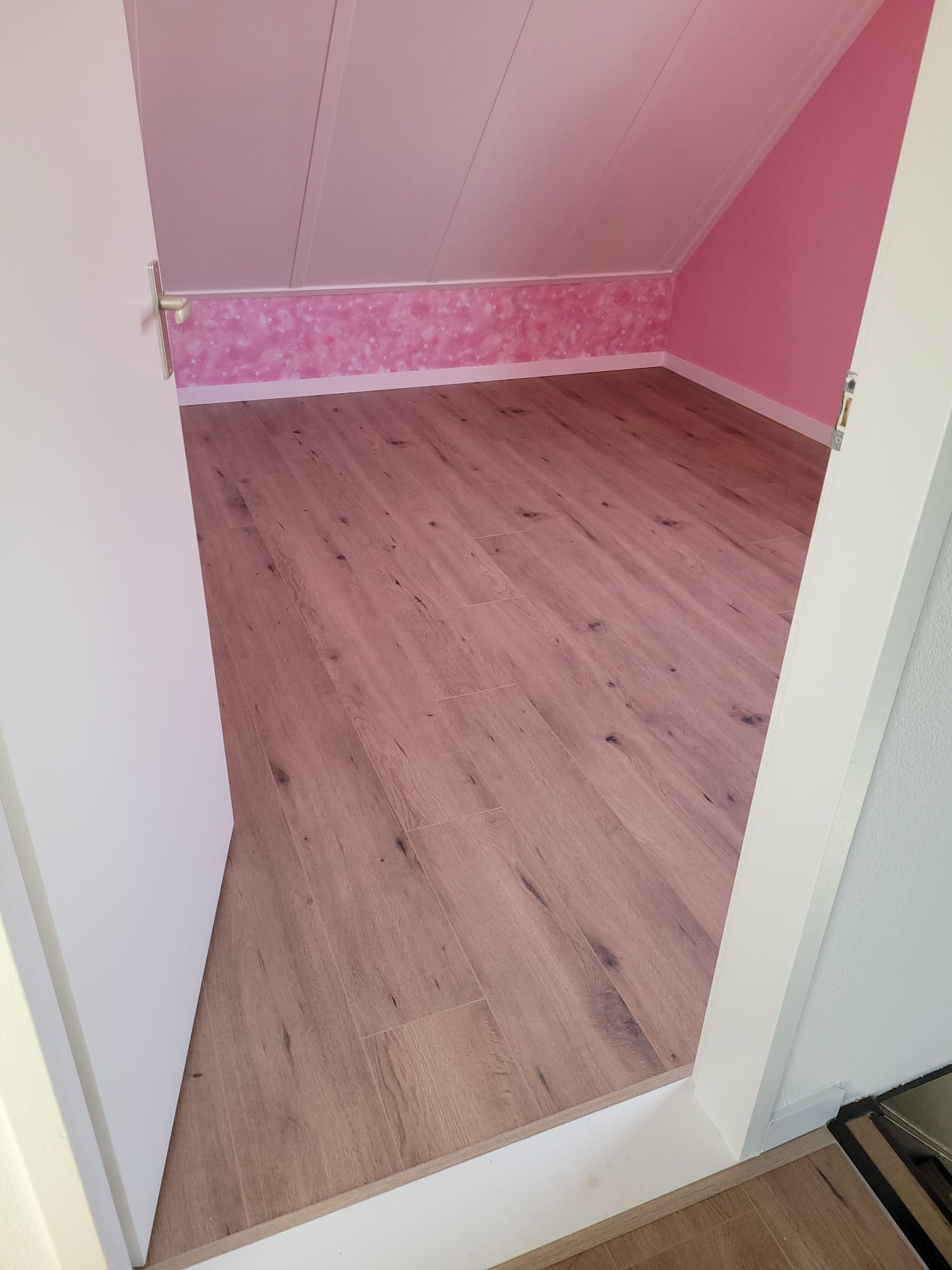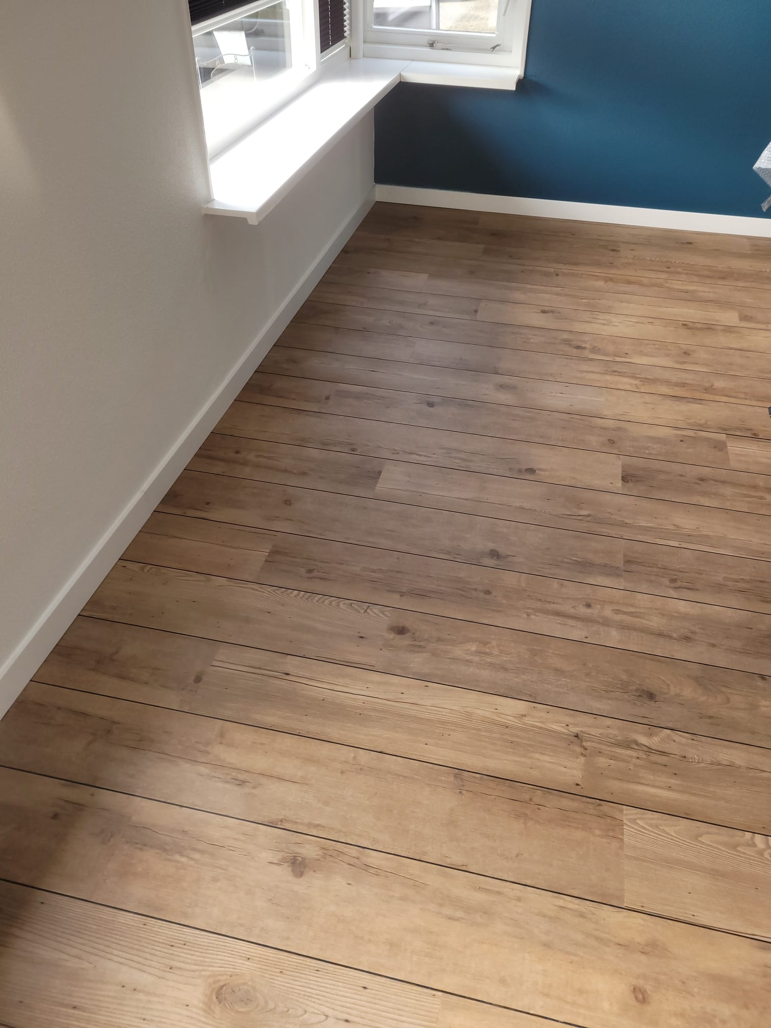 Beneden is gekozen voor PVC van MFlor, de authentic serie, met bies. Al jarenlang 1 van onze best verkochte vloeren. PVC van hoogwaardige kwaliteit, met een mooie matte houtstructuur. Boven is gekozen voor een laminaat vloer van Meister. Deze is gelegd op een accustimax ondervloer. Dit is de meest geluid- reducerende ondervloer. Ook is de trap bekleed bij deze klant, maar daar moeten de puntjes nog op de i worden gezet. Dus deze foto’s volgen later.