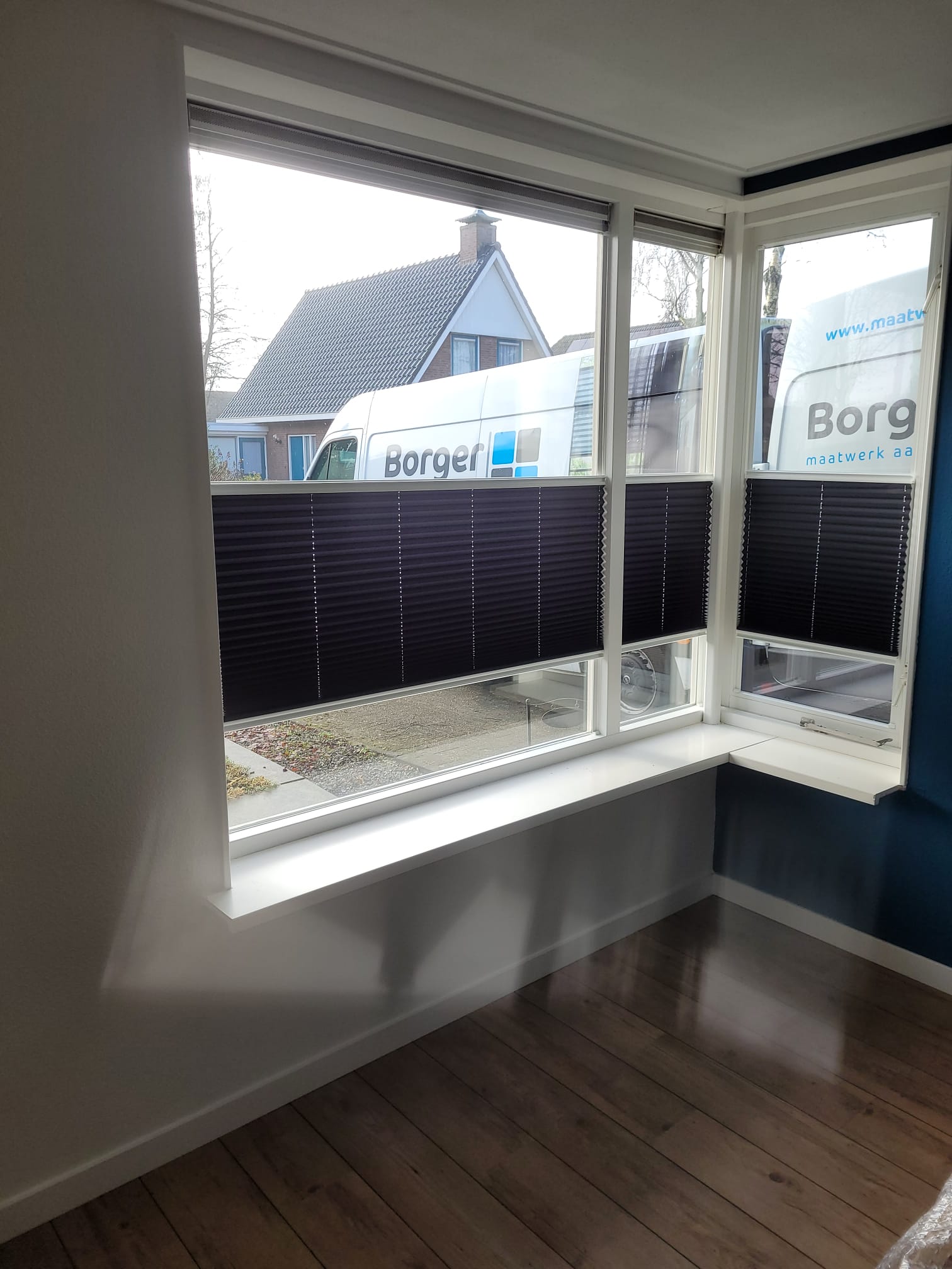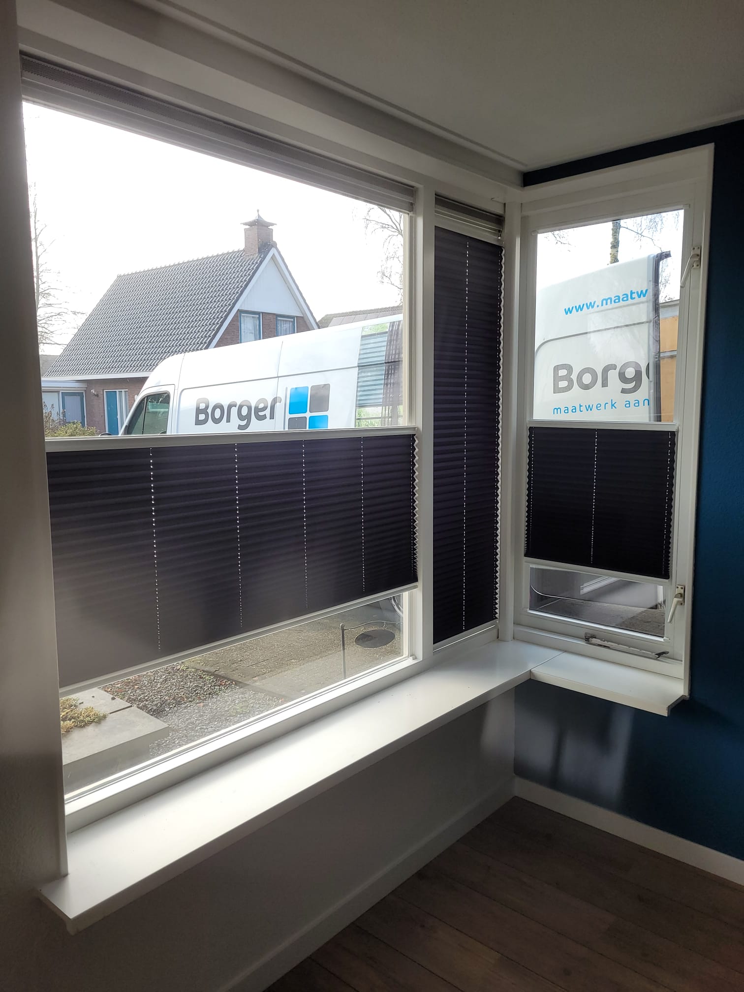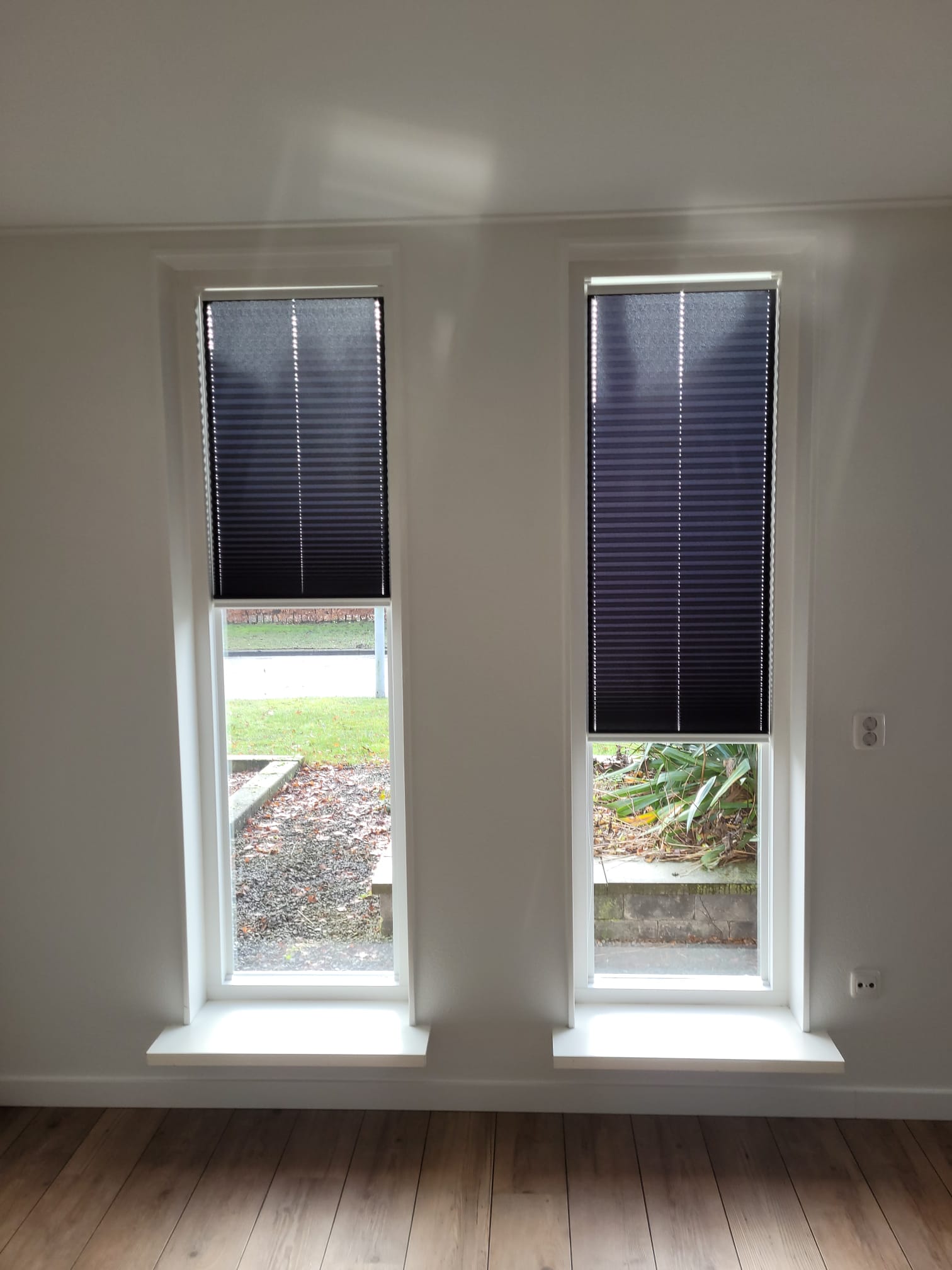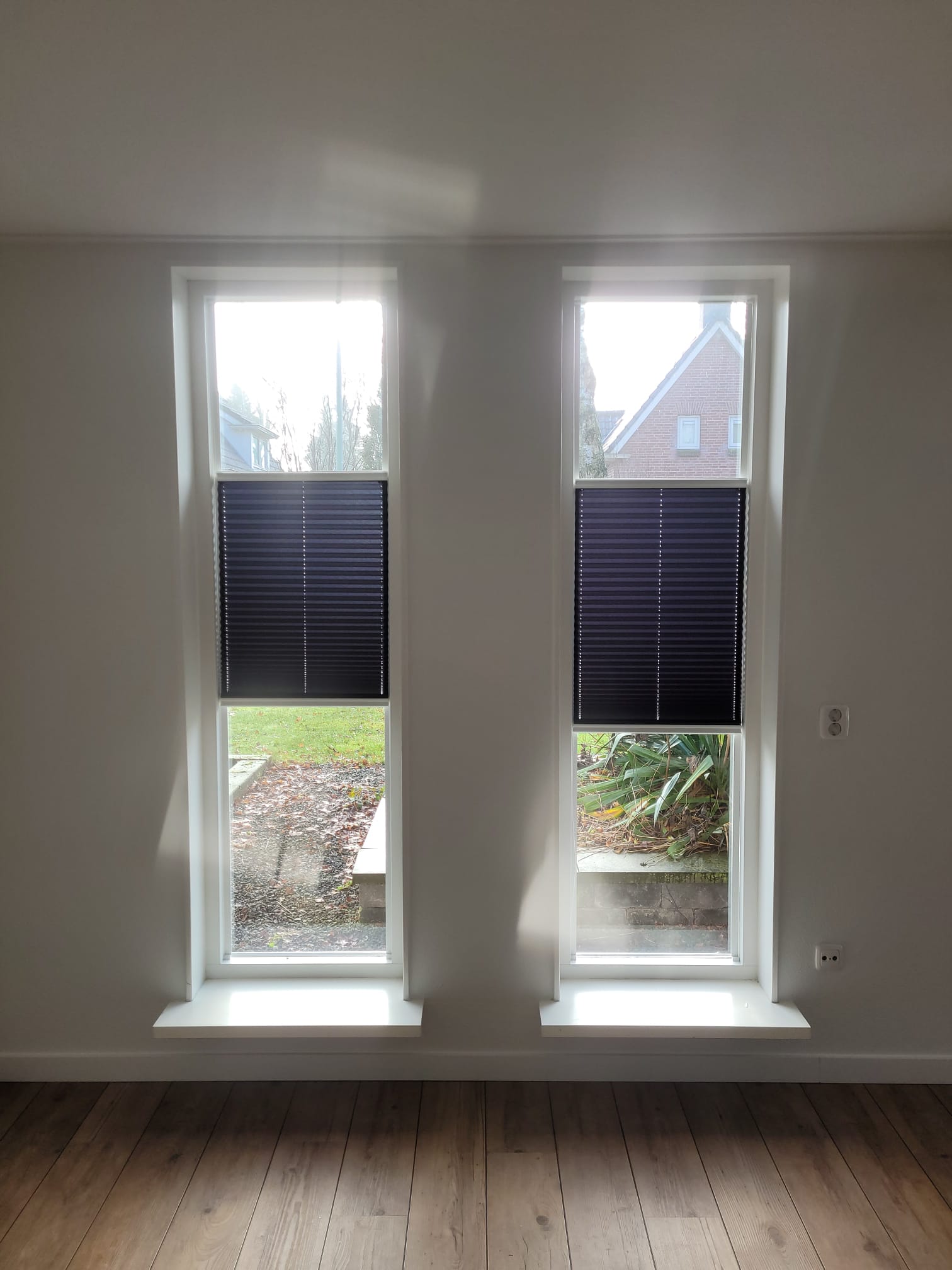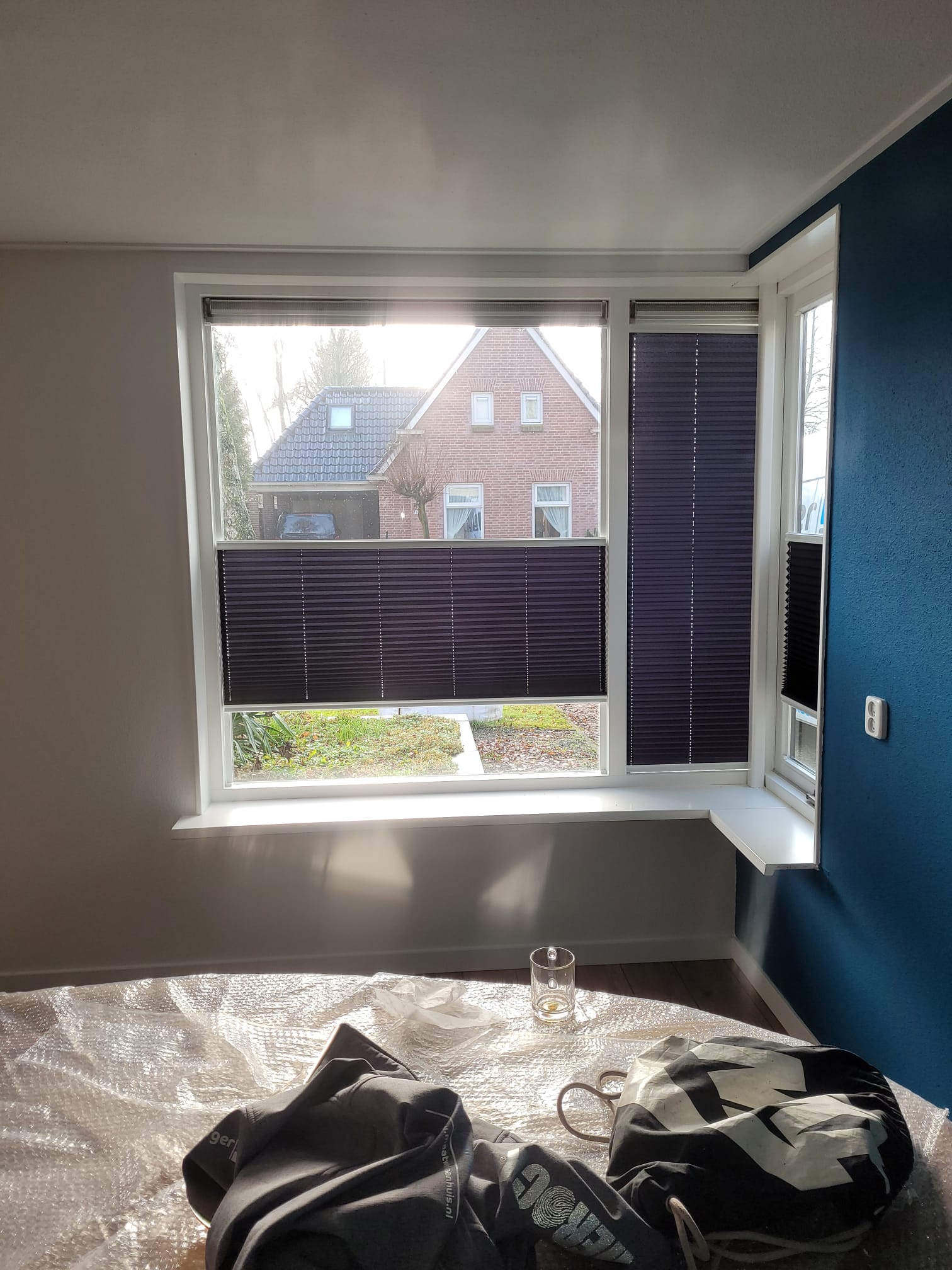Als raamdeco is gekozen voor EasyFit systemen, plissé. Deze systemen zijn bottum-up en top down te bedienen, zonder koord. De EasyFits worden degelijk op het raam gemonteerd met plakstrips. Als het raam gewassen moet worden, klik je het systeem er makkelijk uit.