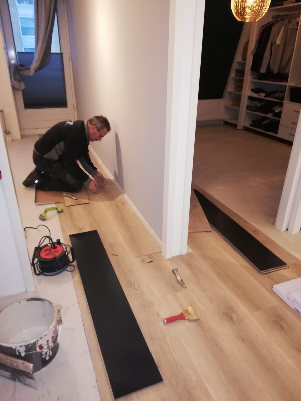 Na het egaliseren van de vloer en een “uitharddag”, zijn we aan de slag gegaan met het verlijmen van de PVC. Bij de begane grond kan je vaak iets sneller doorleggen. Op de 1e verdieping heb je vaak te maken met verschillende vertrekken en daardoor meer hoekjes en dus meer werk. Maar daar draait het Maatwerkteam hun hand niet voor om.