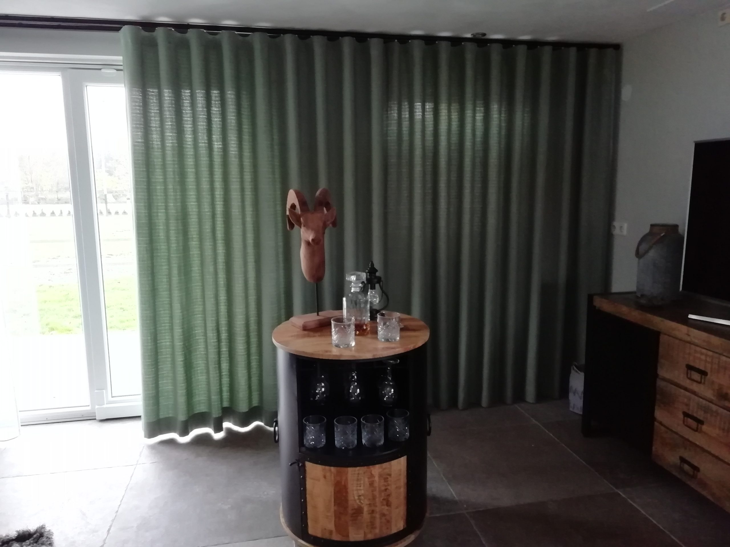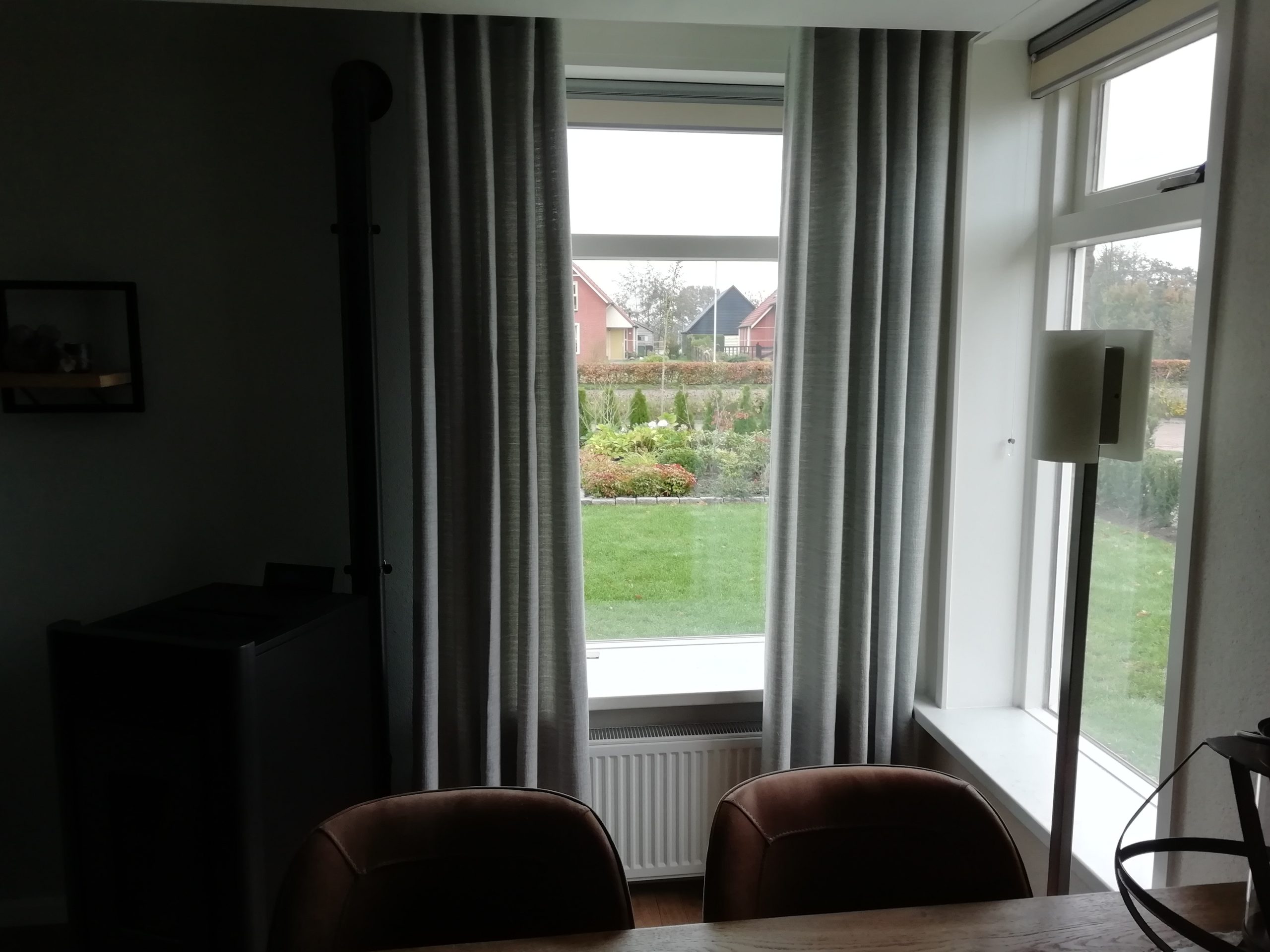 - Bovenstaande overgordijnen hangen aan de mat zwarte roedes die net even wat meer sfeer geven dan de standaard witte roedes.