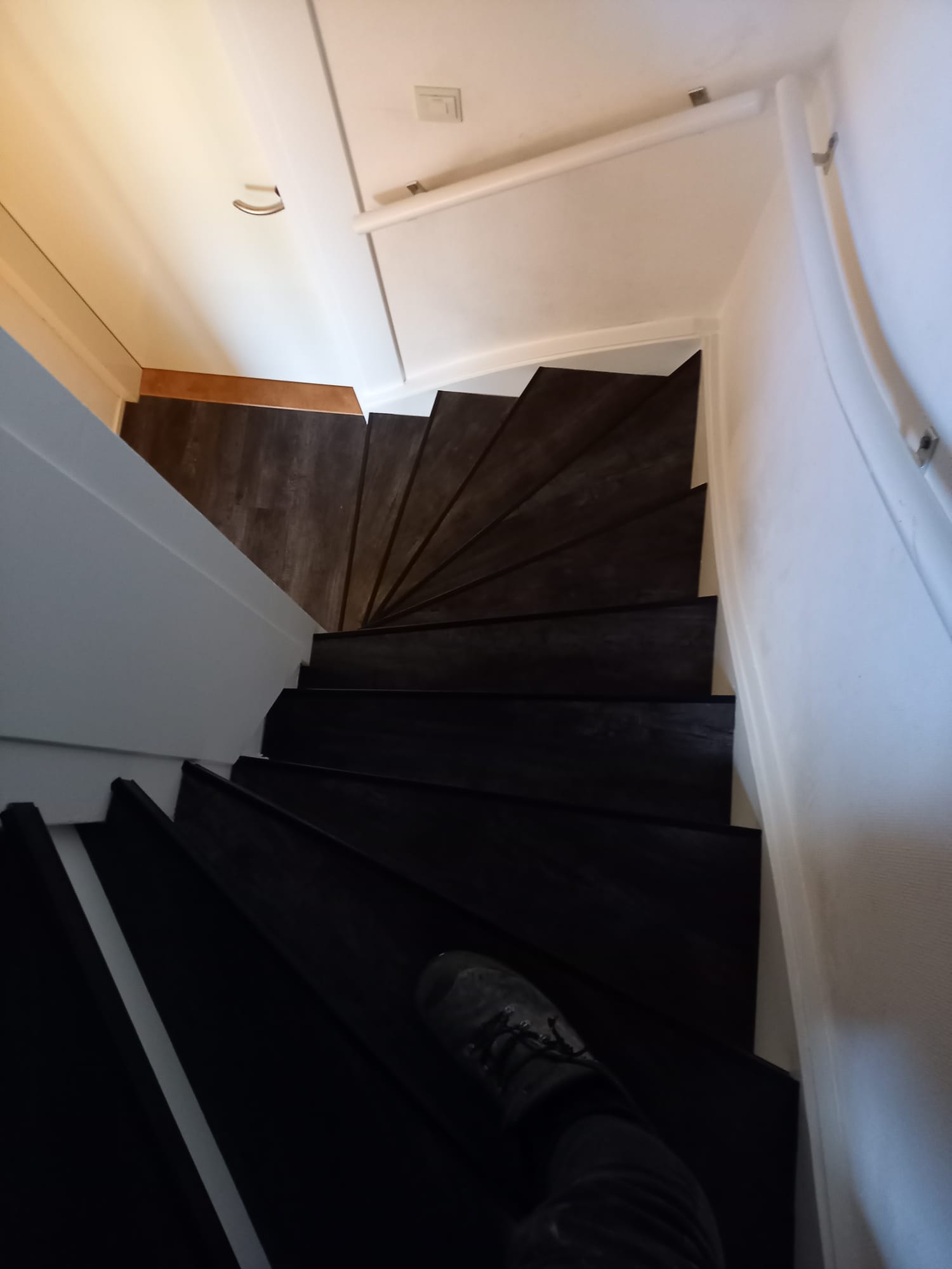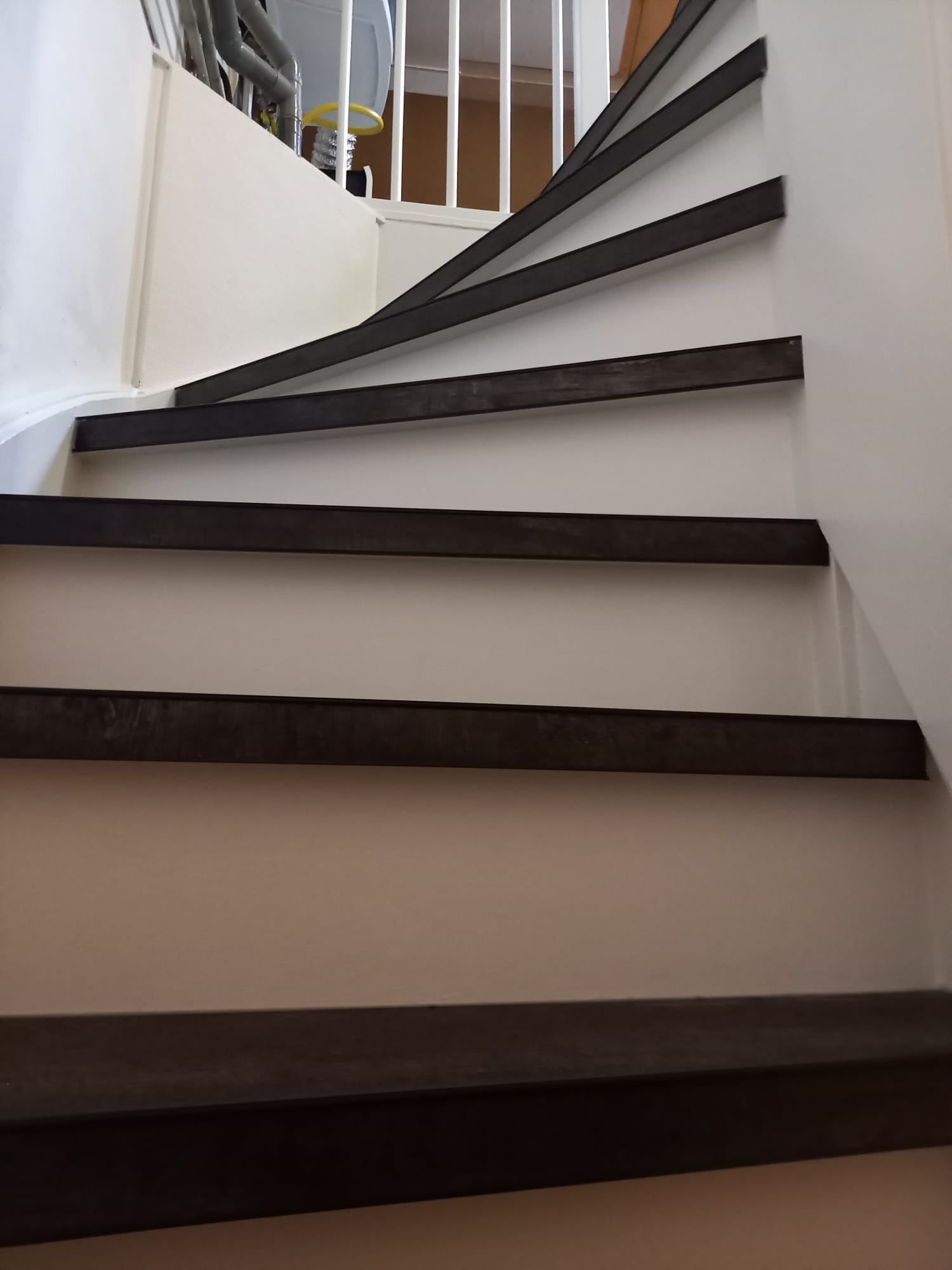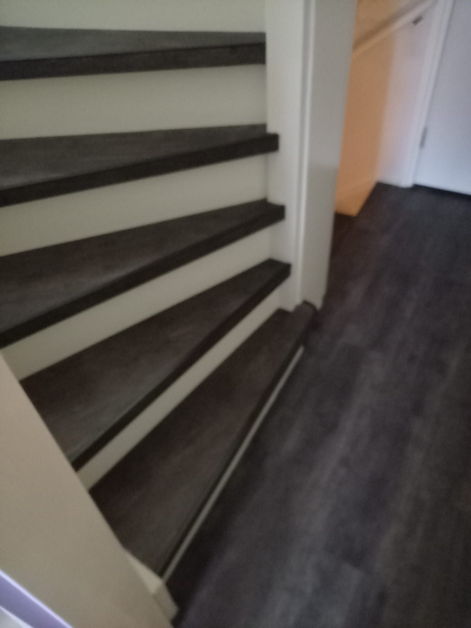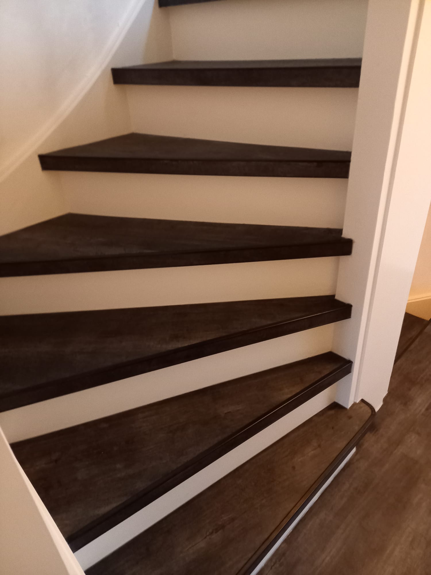 De trappen zijn bekleed met PVC van Aspecta Pumica. De stootborden zijn wit geverfd met RAL 9010 zijdeglans.