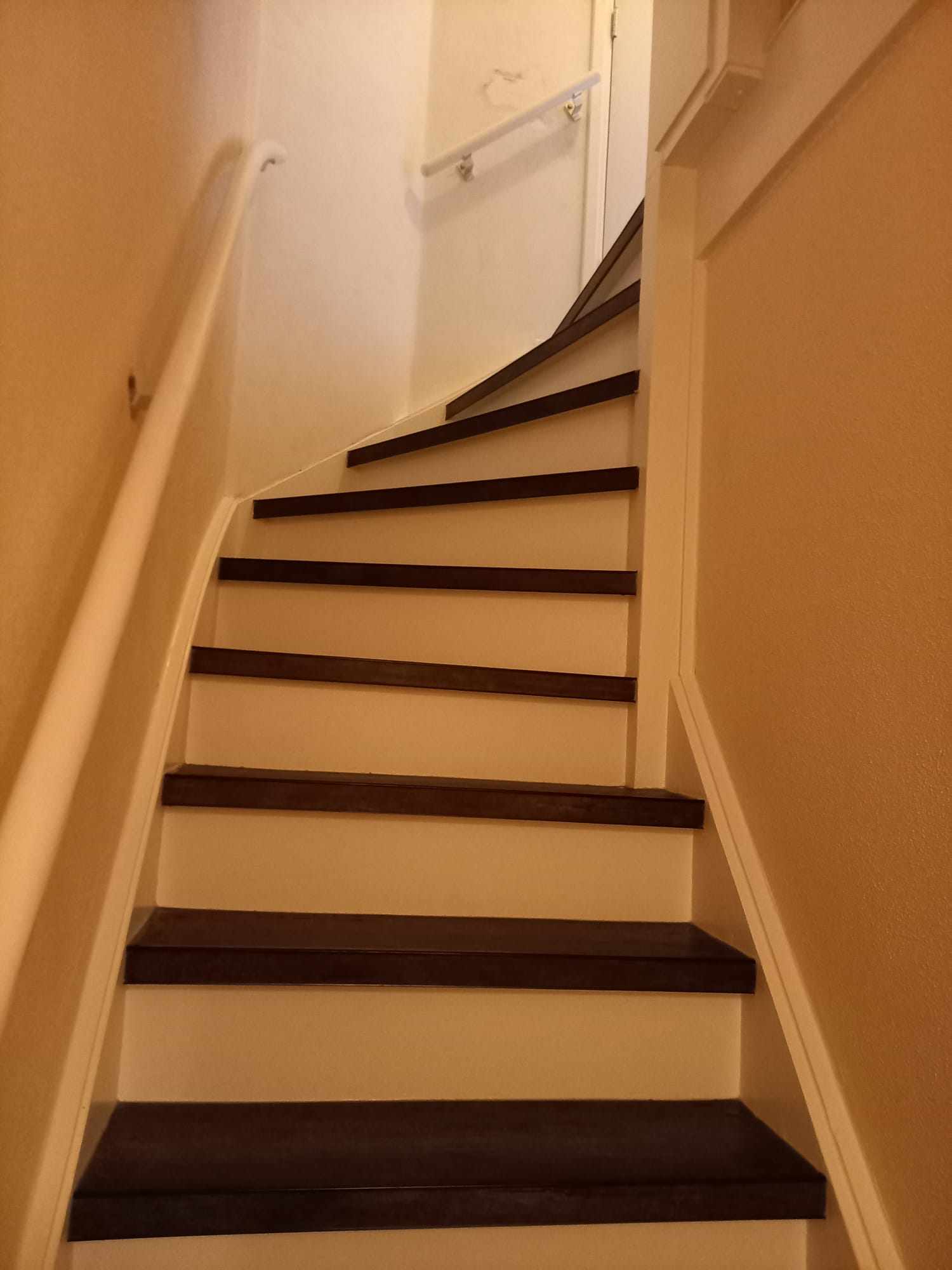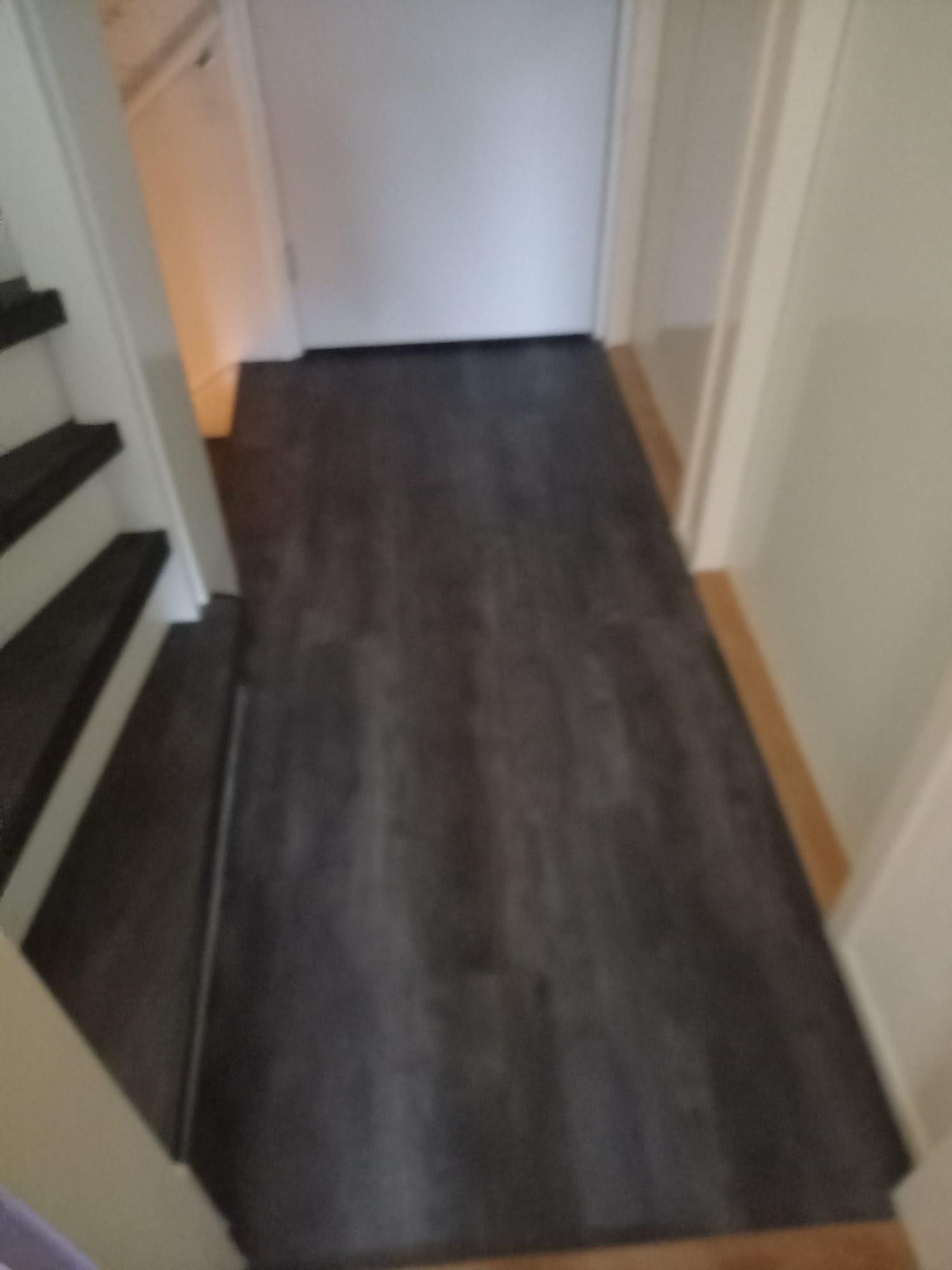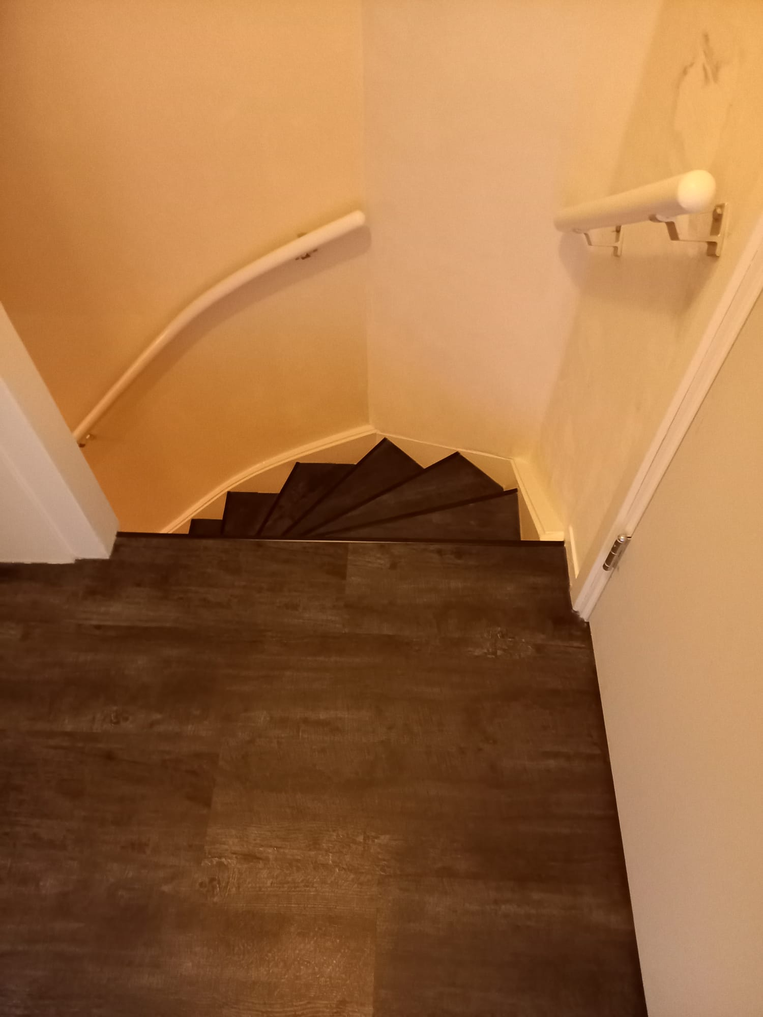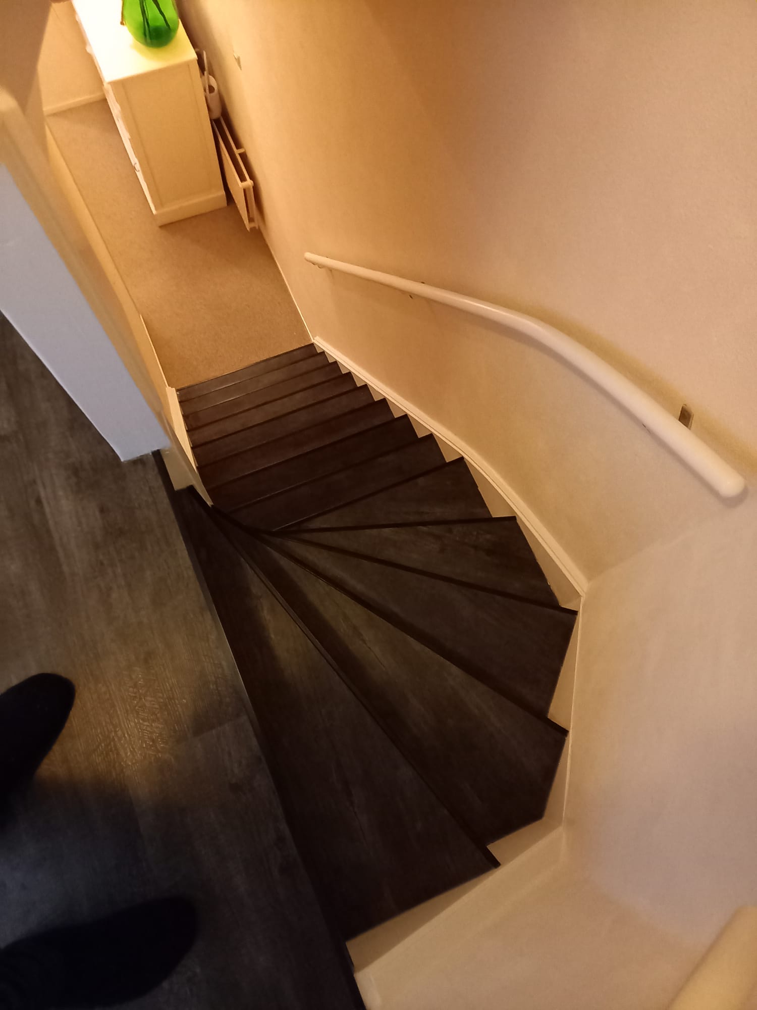 De trappen zijn bekleed met PVC van Aspecta Pumica. De stootborden zijn wit geverfd met RAL 9010 zijdeglans.