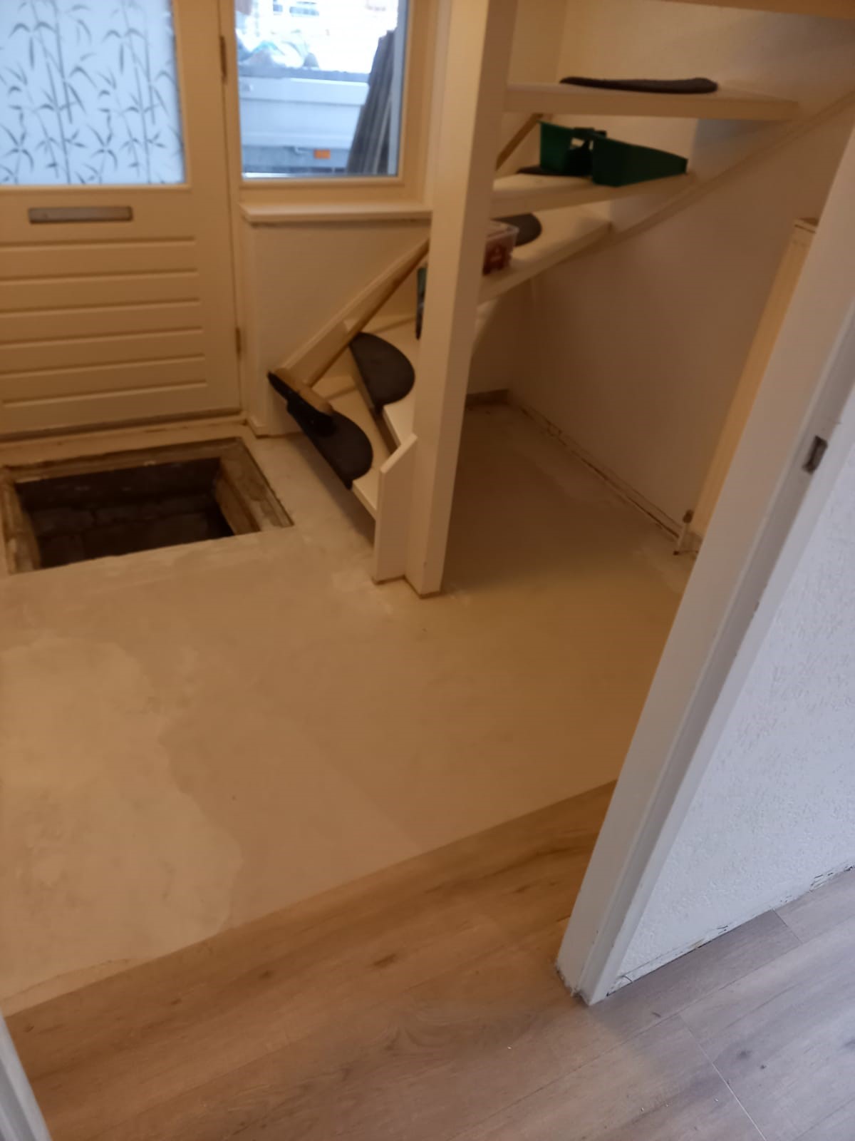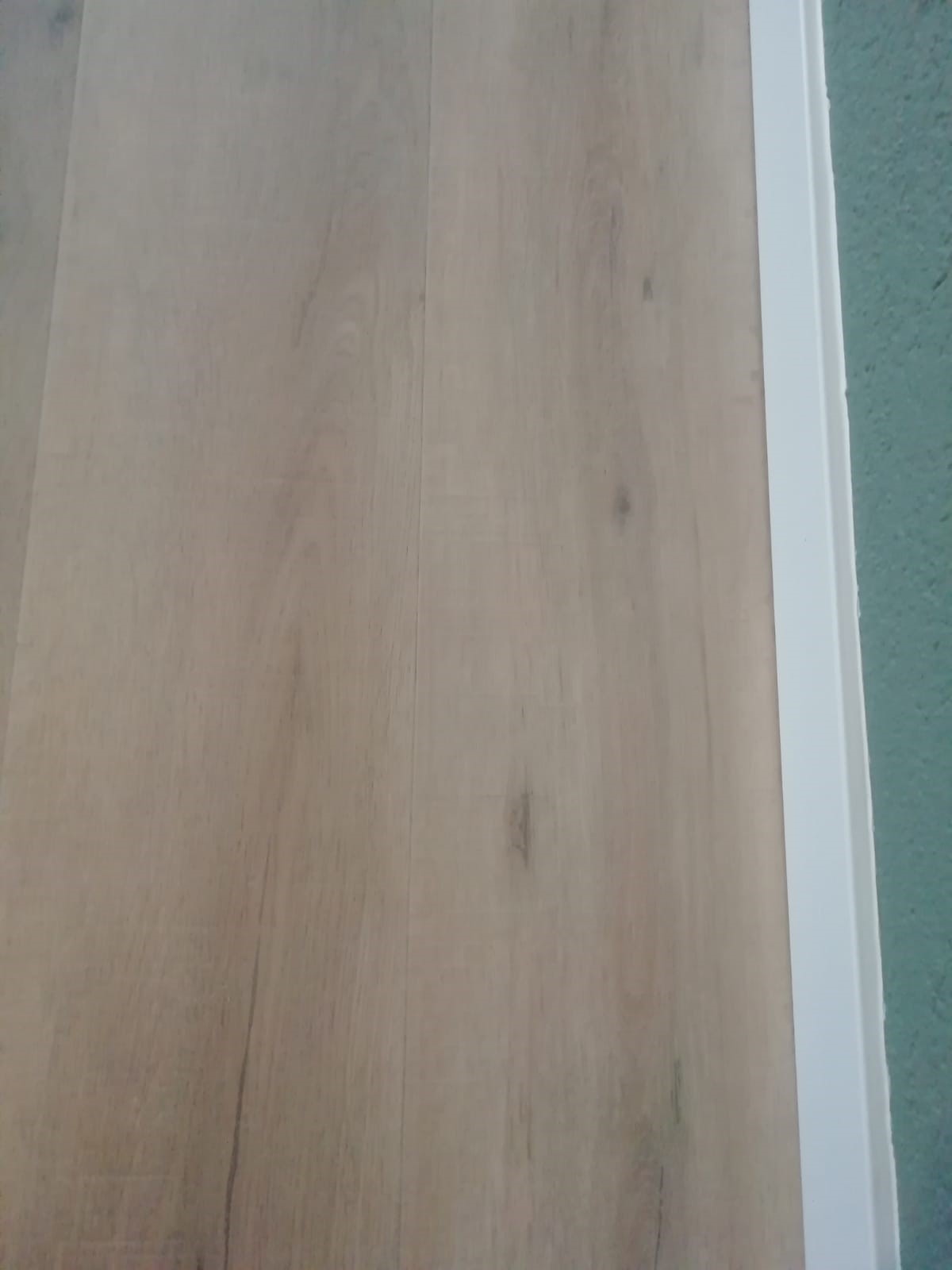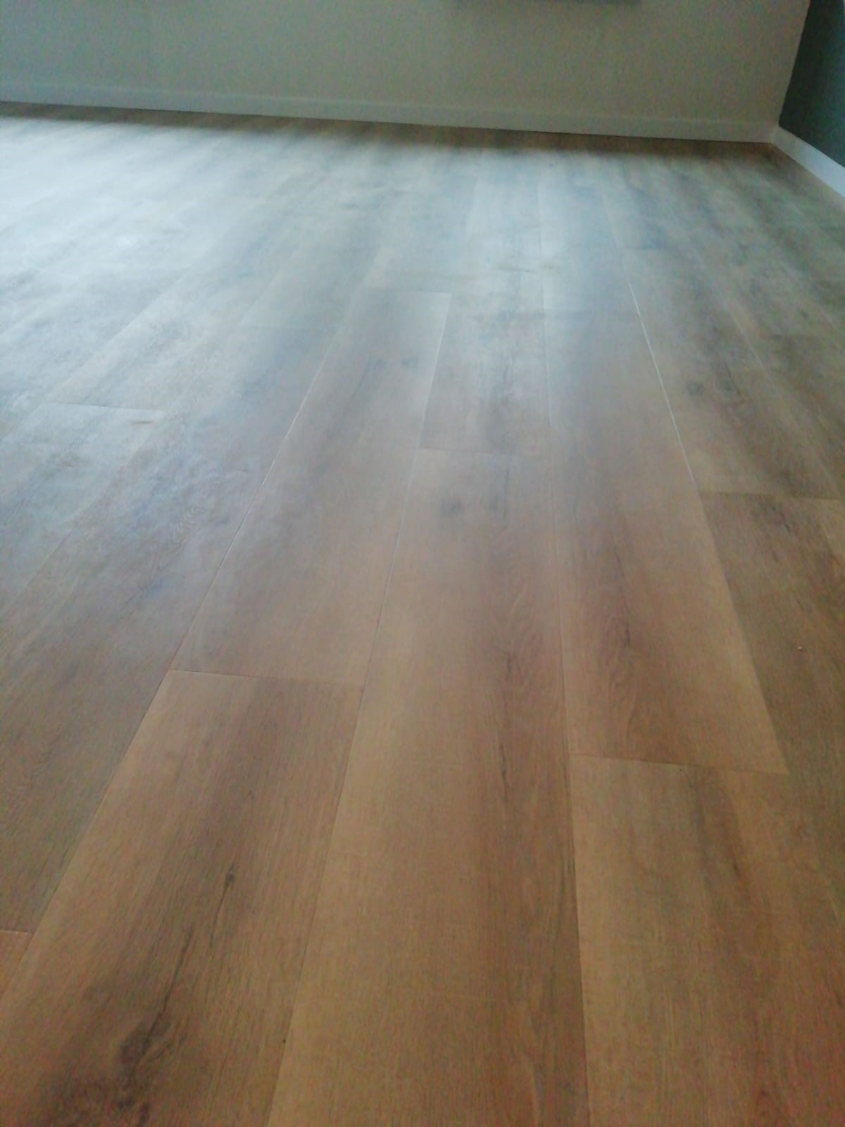 Deze vloer heeft een bredere plank en is white wash afgewerkt. De 8 cm hoge plint maakt het geheel af.
