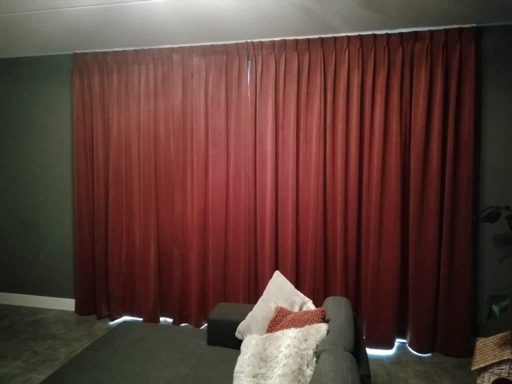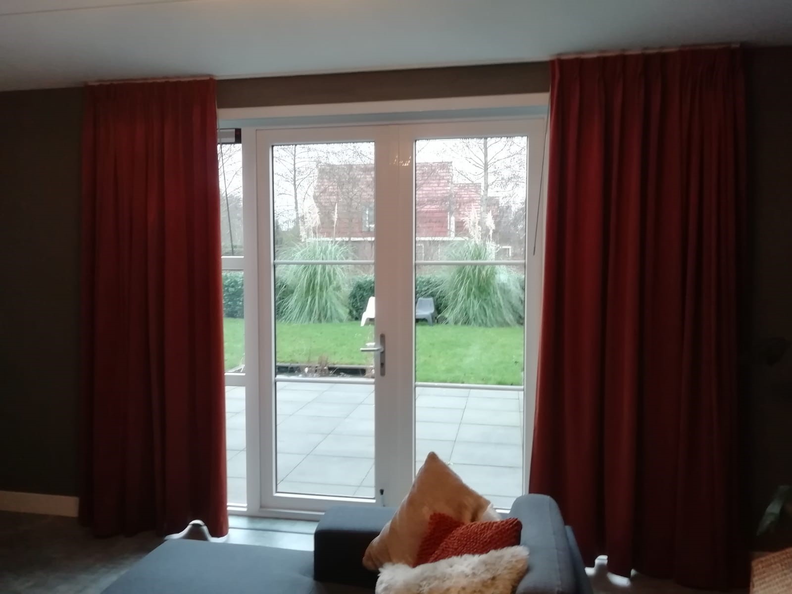 Dit keer voor een traprenovatie en gordijnen. De traprenovatie is in het voorgaande project aan bod gekomen. Deze overgordijnen (Isla Roest) in de woonkamer kleden het geheel prachtig aan.